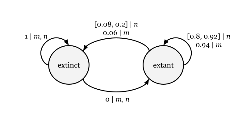 extinctextantextinct10extant[0.08,0.2][0.8,0.92]where the numerical entries denote probabilities (of transitioning from states labeling the rows to states labeling the columns) and intervals denote credal sets.