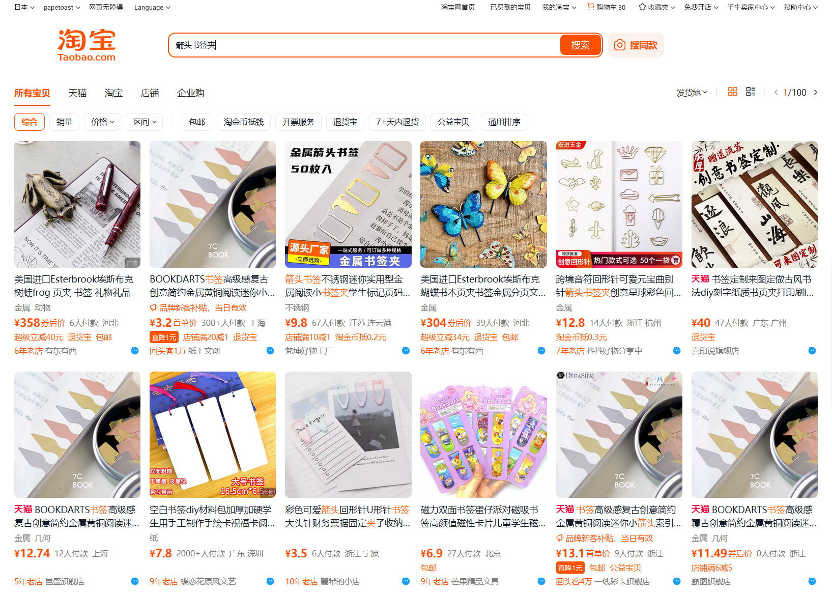 https://s.taobao.com/search?ie=utf8&q=箭头书签夹&search_type=item (login required)