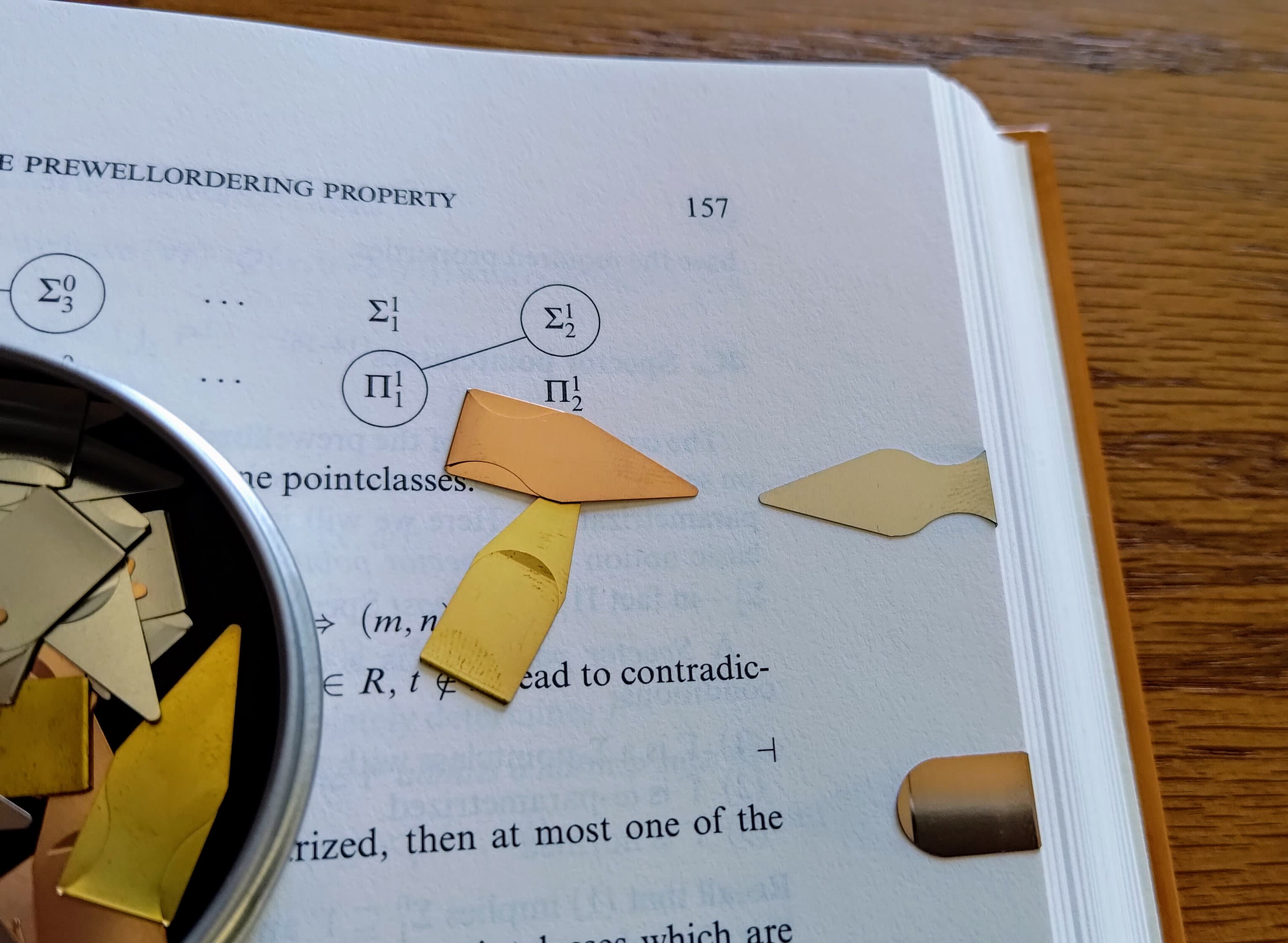 I think Book Darts are a Pareto improvement for normal fiction book reading. But as a math researcher, I find that they’re way better for the use-case of marking places in textbooks. If I’m confused about Baire’s category theorem, I can look it up in the index, stick a Book Dart in each of the three places it’s referenced, and position them to point at the exact lines. I can put the book back on the shelf and they won’t shift position, so when I pick up my studying next week I can experience something closer to restoring all the tabs in my browser session.