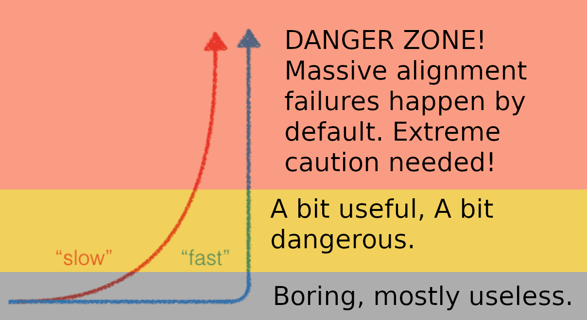 In more “slow takeoff” scenarios. Your approach can probably be used to build something that is fairly useful at moderate intelligence. So for a few years in the middle of the red curve, you can get your factories built for cheap. Then it hits the really steep part, and it all fails.