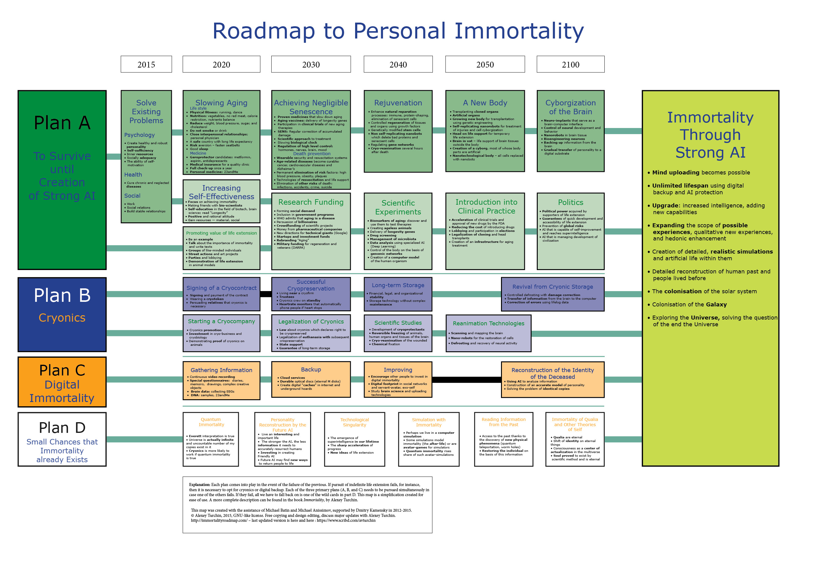 This plan includes actions to defeat aging, to grow and replace diseased organs with new bioengineered ones, to get a nanotech body and in the end to be scanned into a computer. It is an optimized sequence of events, and depends on two things – your personal actions (such as regular medical checkups), and collective actions such as civil activism and scientific research funding.