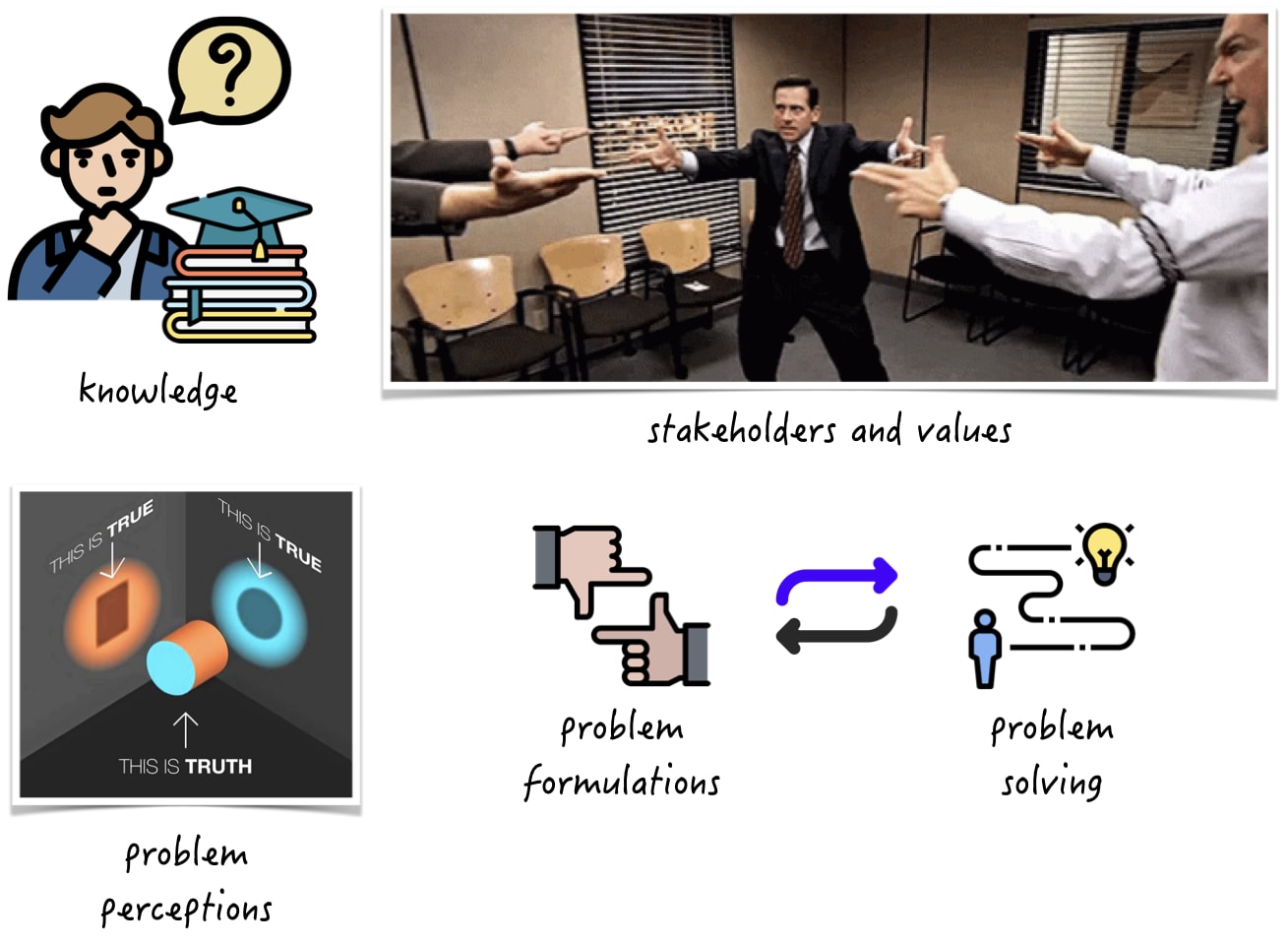 Real-world political decision-making problems are complex, with disputed knowledge, differing problem perceptions, opposing stakeholders, and interactions between framing the problem and problem-solving.