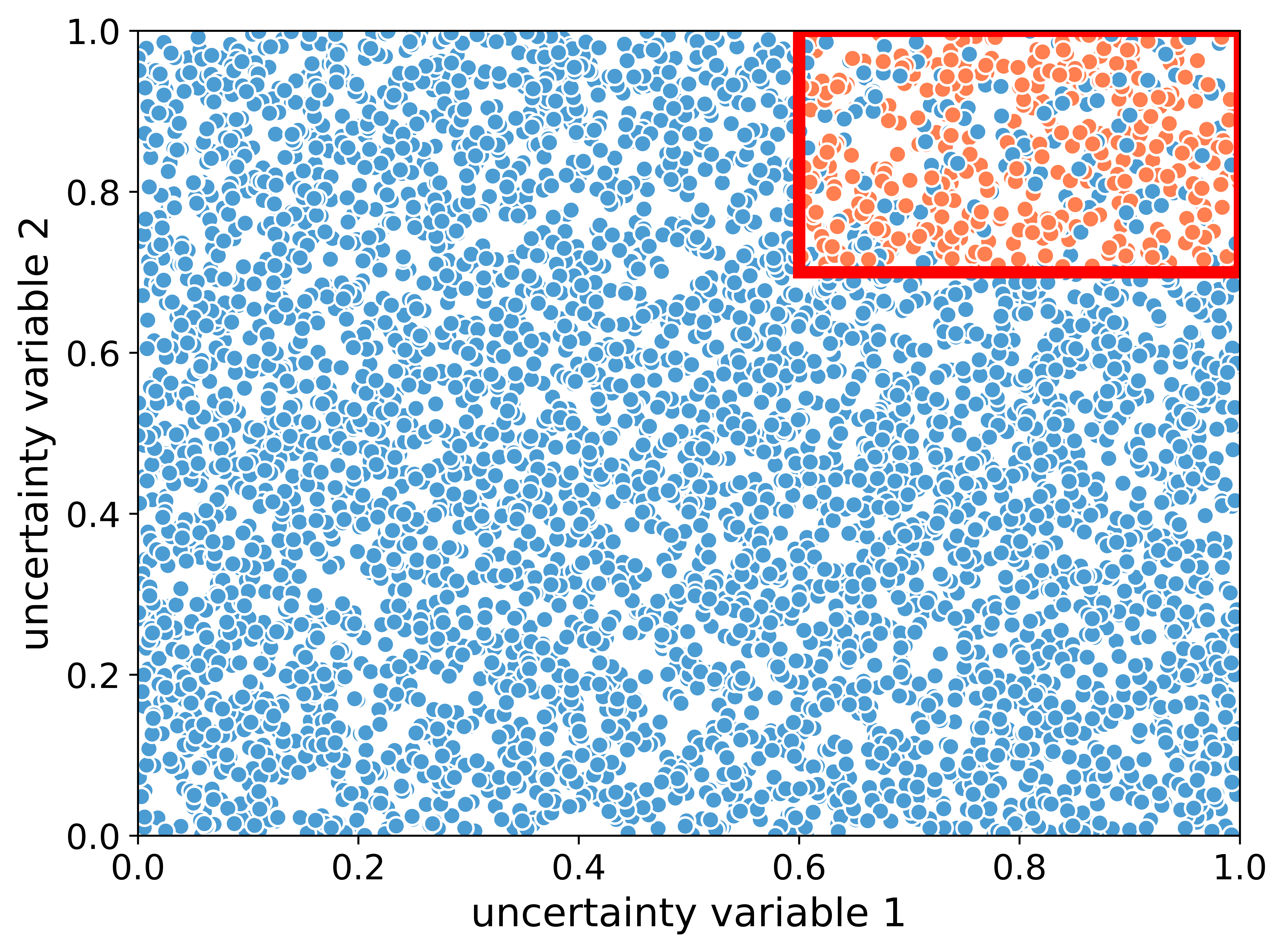 Every dot represents one scenario. What we usually want to do, is find the vulnerable subspace, i.e. the space where we find the scenarios which lead to the most bad outcomes (e.g., defined by some constraints on our objectives). The red dots in the figure below represent such bad scenarios. The red box marks the vulnerable subspace. Note that there are also okay scenarios in that box but that is fine. We do not need to define a subspace that contains only scenarios with bad outcomes. A rough subspace where more scenarios of bad outcomes are predominant is sufficient.