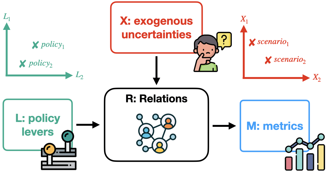 X: Exogenous Uncertainties. These are variables that a decision-maker has no control over but will, however, still affect the system and therefore the performance of policies. All uncertainty variables span the uncertainty space. A point in that space is called a scenario.