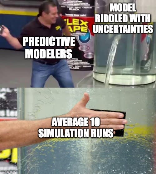 What they often do is simply ignore uncertainties. Instead of using a full range (see the above example), they just collapse it into a single number. This is of course very problematic. When dealing with the real world, that makes little sense as some assumptions might likely be wrong. And in this case, your resulting policy recommendations become obsolete. Another way how predictive modelers handle deep uncertainties is summarized in the next meme.