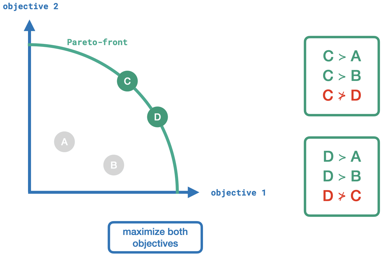 We can see that both, C and D, dominate A and B. But neither C nor D dominates each other. We consider outcomes C and D to be part of the so-called Pareto-front.
