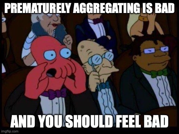 Generally, premature aggregation can be bad in general because it can oversimplify complex phenomena and obscure important details and nuances. Premature aggregation can result in the loss of important information about the underlying factors that contribute to the data. This loss of information can lead to biased or incomplete assessments of the data and mask important trends or patterns. Aggregation can oversimplify complex phenomena by collapsing multiple dimensions into a single measure or index. This oversimplification can result in inaccurate or misleading conclusions and mask important trade-offs and uncertainties. And eventually, aggregation can also hide underlying assumptions and modeling choices that may influence the results of the analysis. These hidden assumptions can make it difficult to compare the results of different models or assess the robustness of the results.