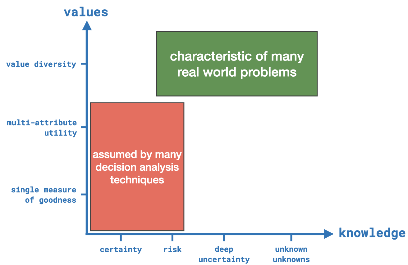 The standard decision analysis techniques assume that real-world political decision-making falls into the red area. We are certain about how systems work or we at least know the probability distributions over the inputs. And at the same time, a single measure or multi-attribute utility are appropriate ways to address the challenges of the real world. However, given our elaborations from above, real-world problems are more complex, exhibit deep uncertainties, and have many stakeholders with partially opposing values that are not easily aggregated. The obvious next question is: What methods can we use to address such problems? The answer is Decision-Making under Deep Uncertainty (DMDU).