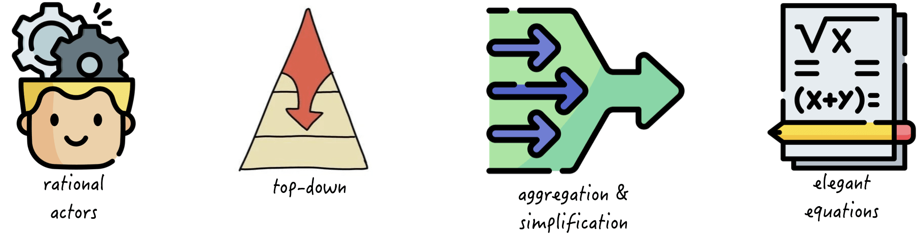 Traditional modeling, particularly in economics, is typically based on the assumption of rational actors making rational choices based on a cost-benefit analysis. This approach, known as rational choice theory, assumes that individuals will act in their own self-interest and maximize their utility based on a set of preferences and constraints. The resulting models are often based on elegant equations and mathematical frameworks and rely heavily on aggregation and simplification to make complex systems more manageable. This approach assumes a top-down view of the world, with individual behavior aggregated into macro-level patterns and trends.