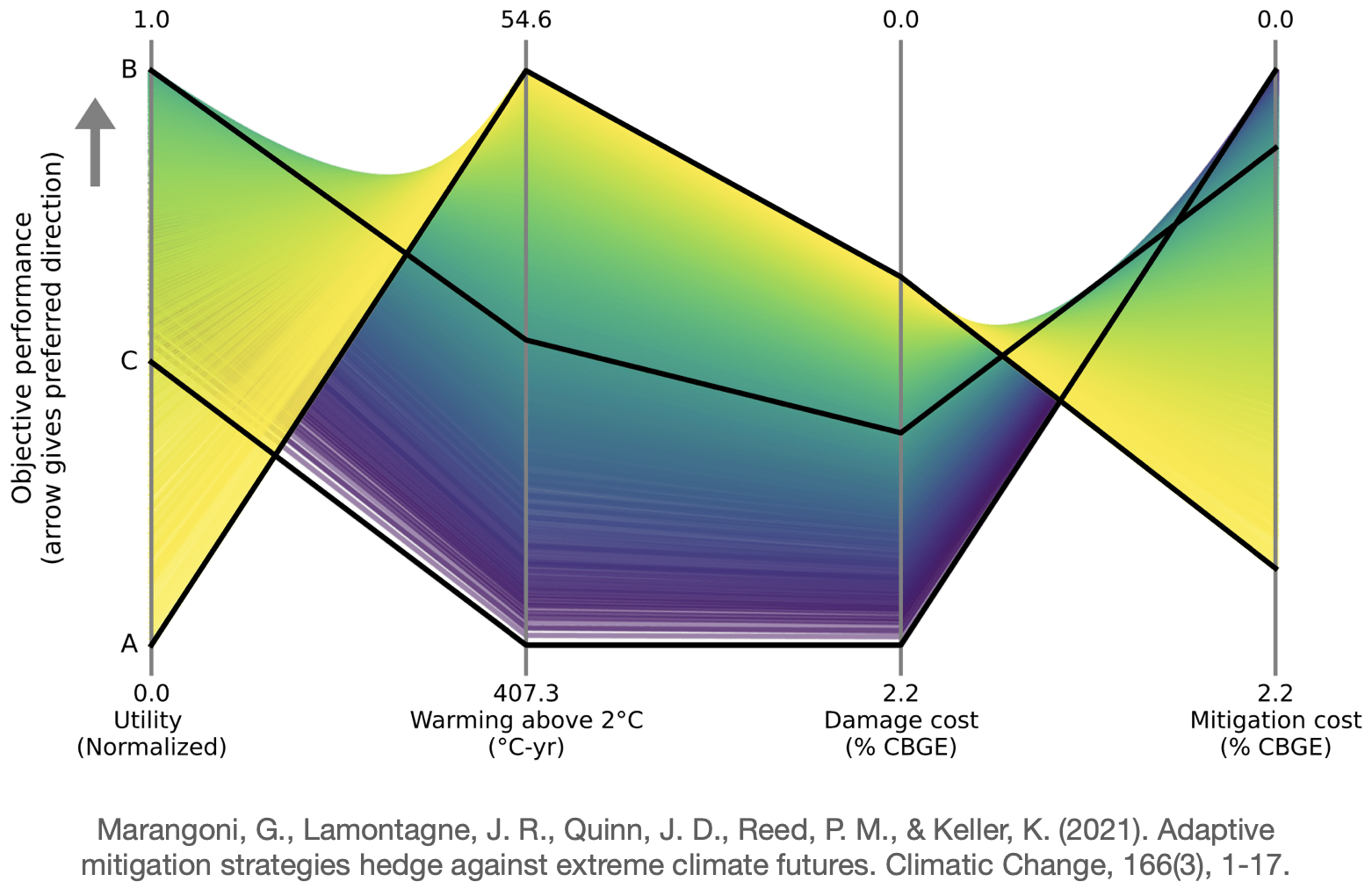Marangoni, G., Lamontagne, J. R., Quinn, J. D., Reed, P. M., & Keller, K. (2021). Adaptive mitigation strategies hedge against extreme climate futures. Climatic Change, 166(3-4), 37.