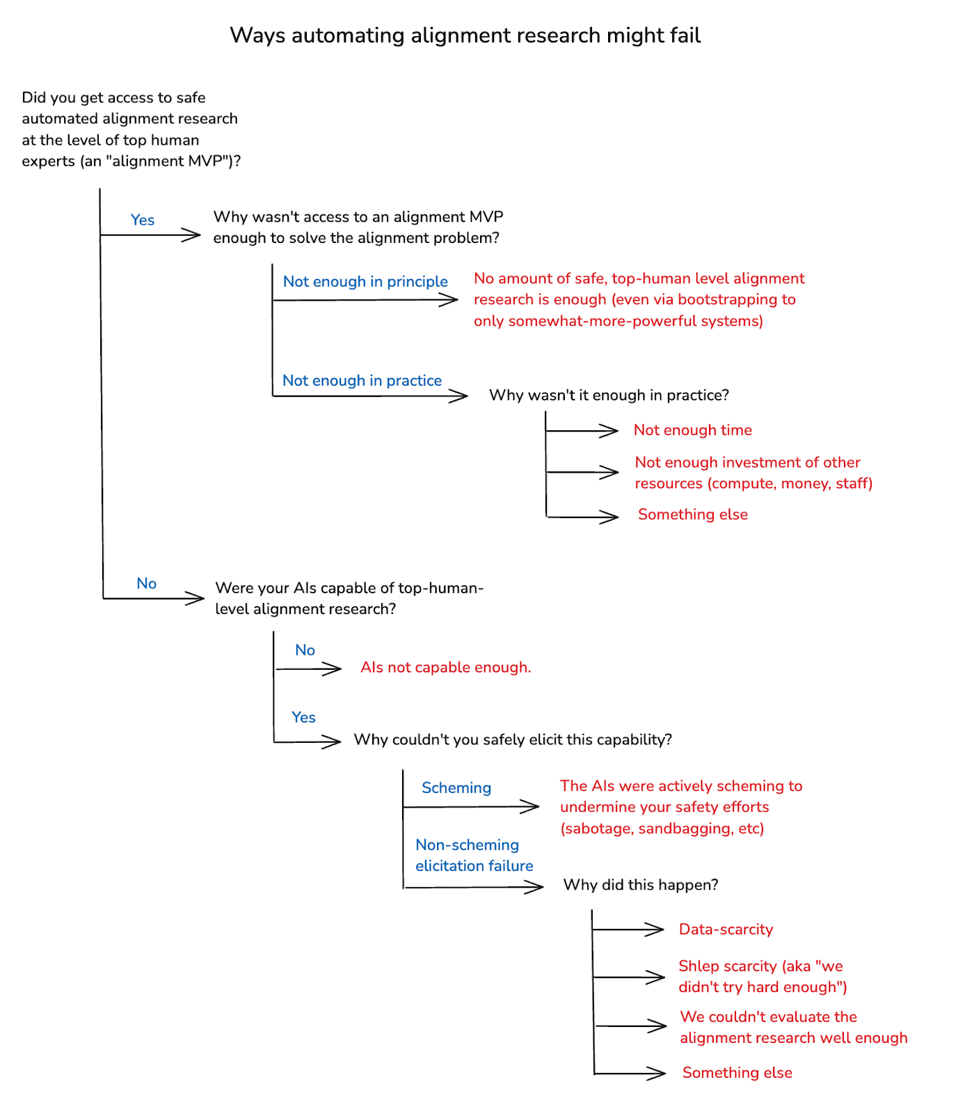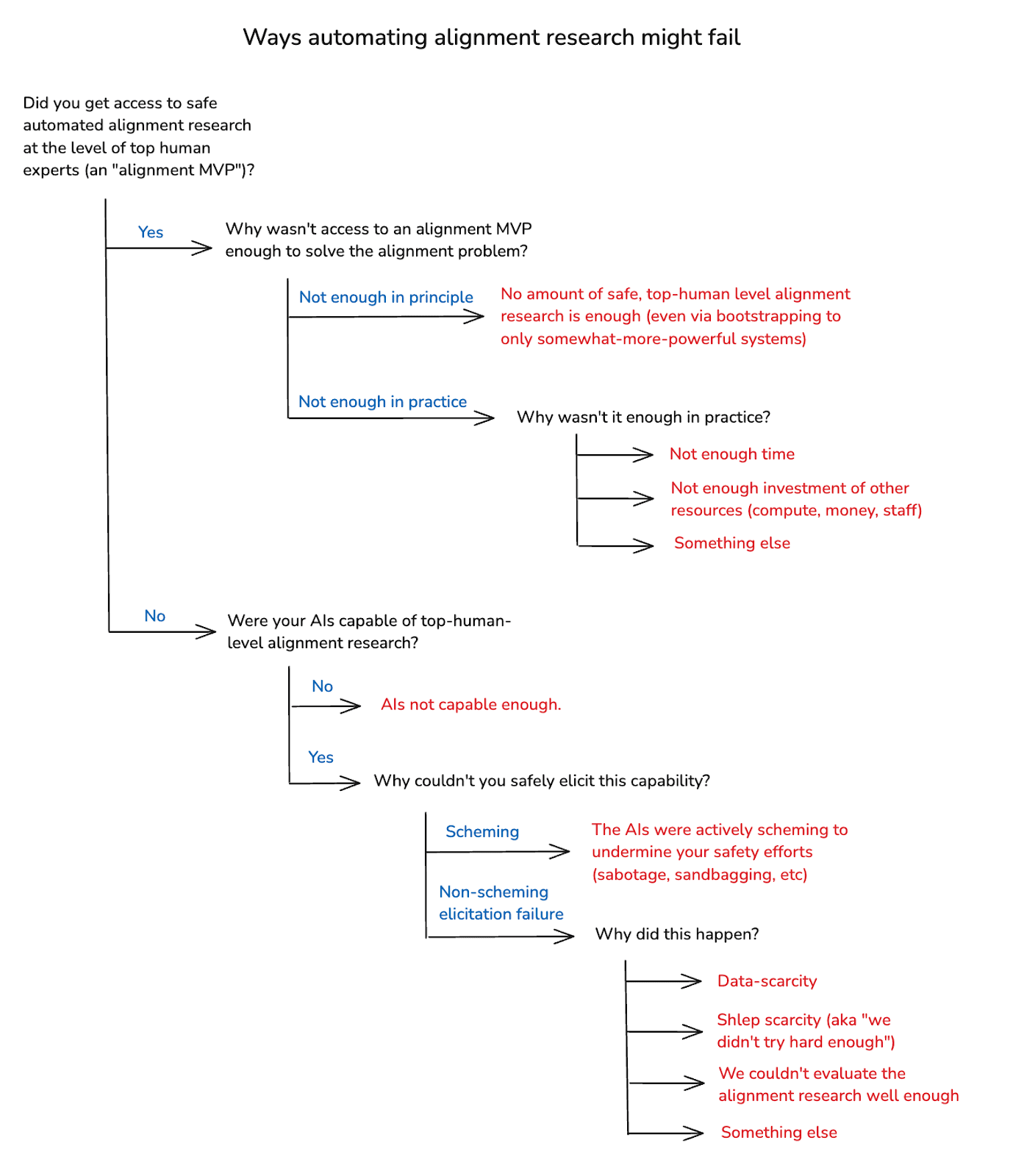 Here’s my rough breakdown of the most salient failure modes. First, start with the question of whether you got access to an alignment MVP, or not. If you did: why wasn’t that enough to solve the alignment problem?
