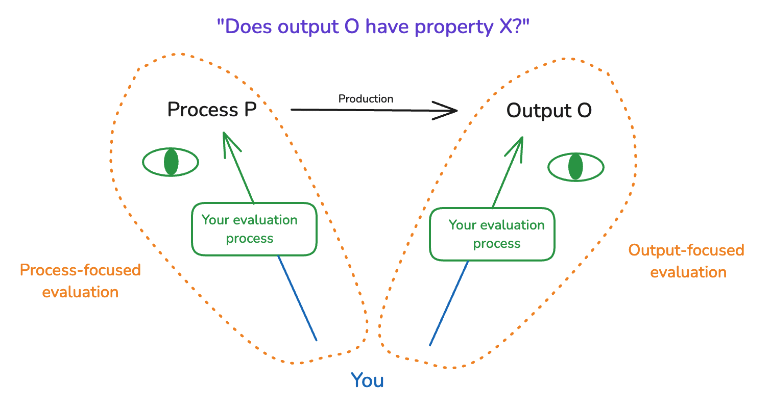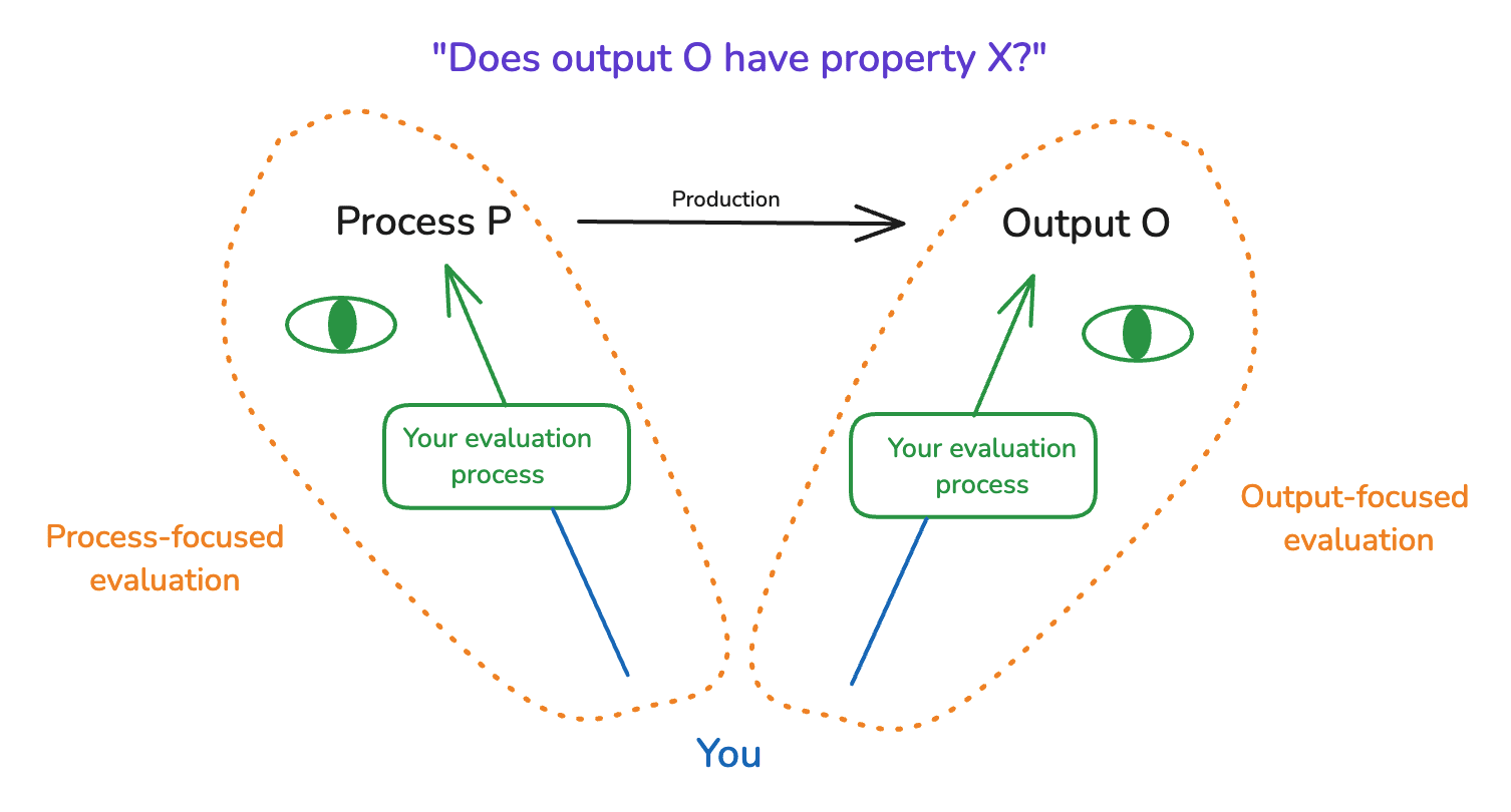 To bring available approaches to evaluating alignment research into clearer view, I distinguish between two broad focal points of an evaluation process – namely, a type of output (e.g., a piece of research), and the process that produced this output (e.g., an AI, a process for creating that AI, etc).