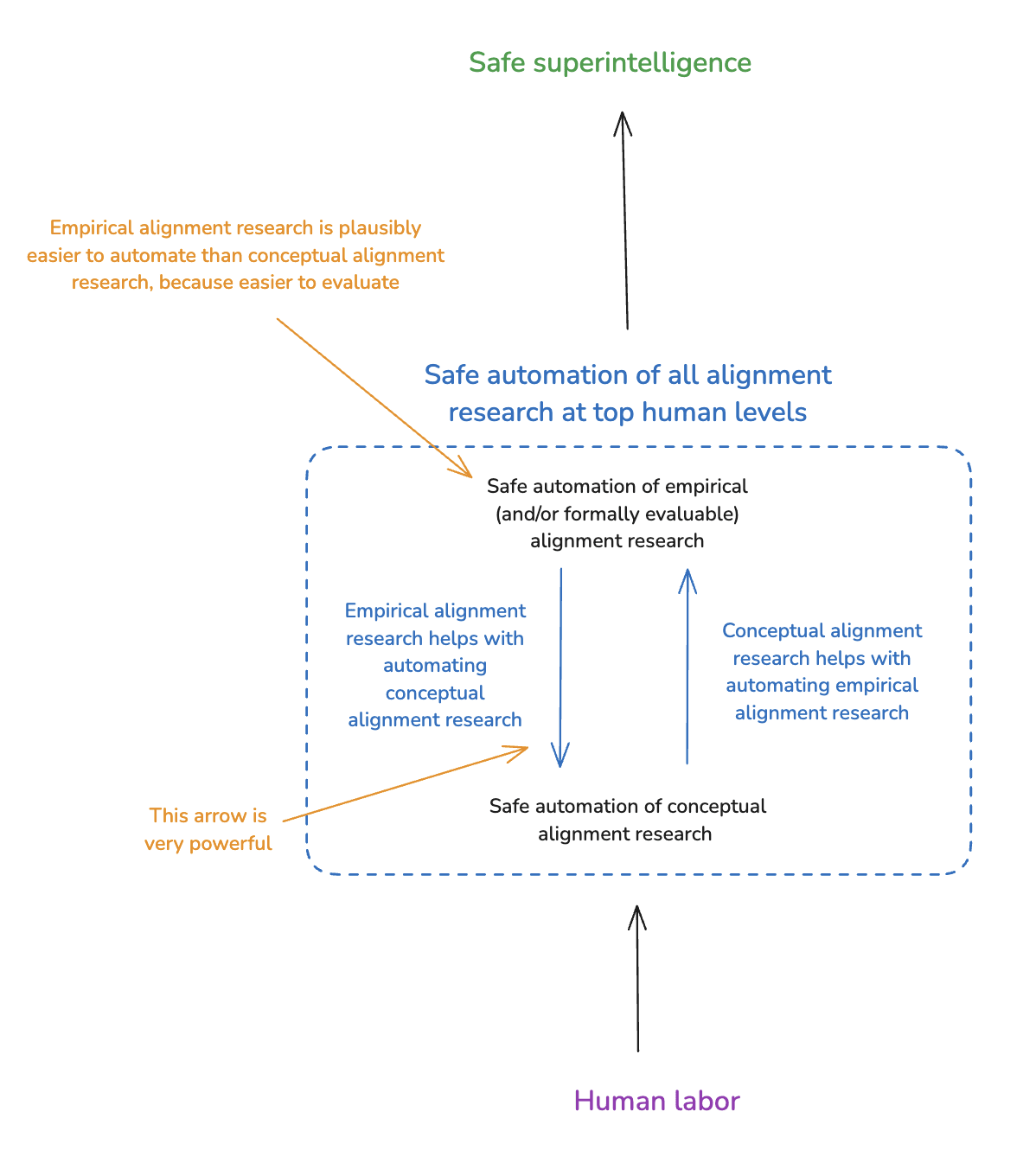 However: I also think that successful automation of empirical alignment research can help a ton with automating the rest of alignment research. In particular: we can use automated empirical alignment researchers to do a huge amount of work testing and improving the output-focused and process-focused evaluation approaches I discussed above – e.g., scalable oversight, behavioral science of generalization, transparency, detecting/preventing scheming, etc. And automated empirical alignment research is extremely helpful in other ways as well (e.g., helping with further automation of empirical alignment research, testing/improving local forms of option control, generating evidence of danger, etc).