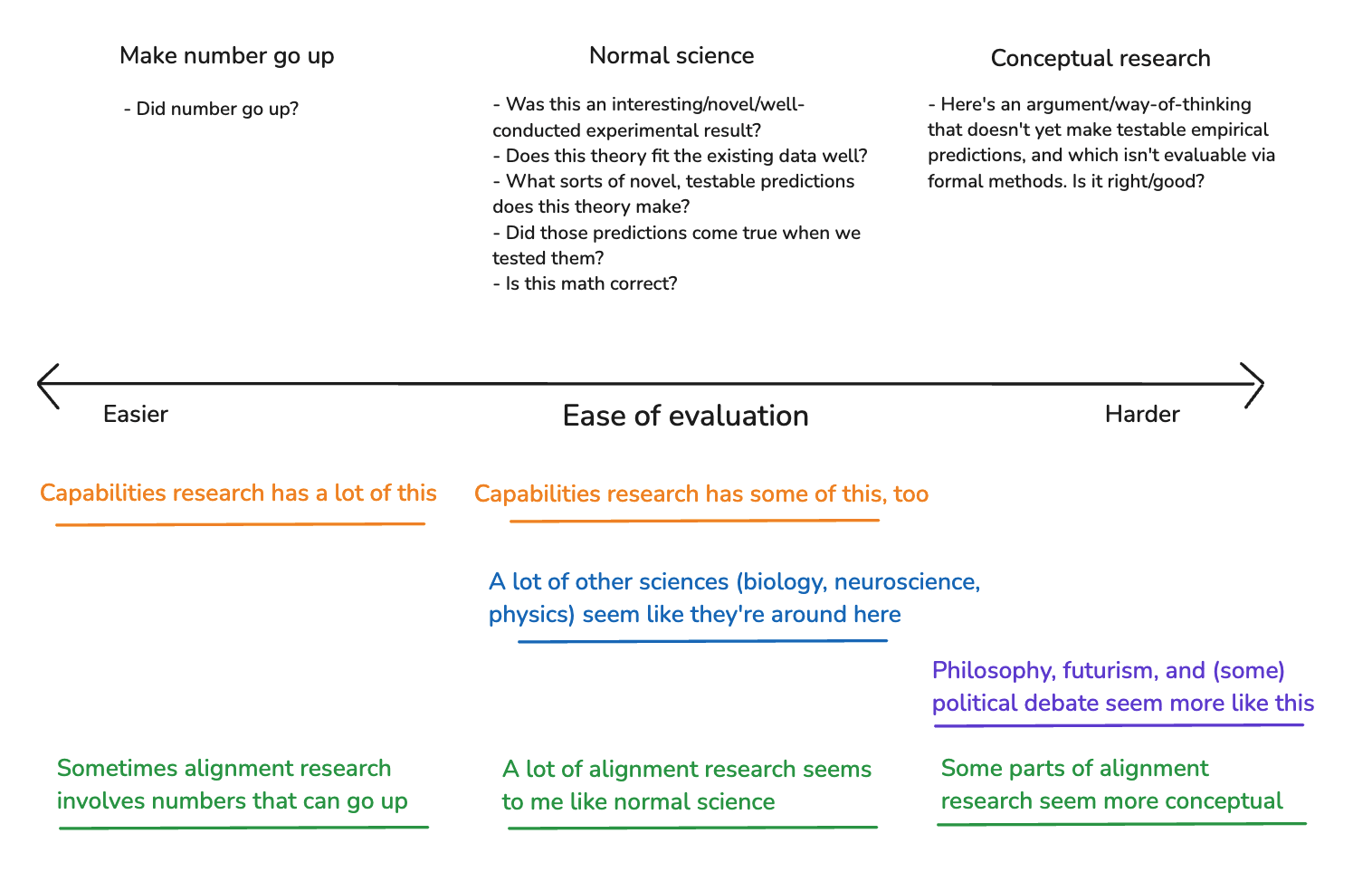 I think that OP’s discussion of “number-go-up vs normal science vs conceptual research” is an unnecessary distraction, and he should have cut that part and just talked directly about the spectrum from “easy-to-verify progress” to “hard-to-verify progress”, which is what actually matters in context.