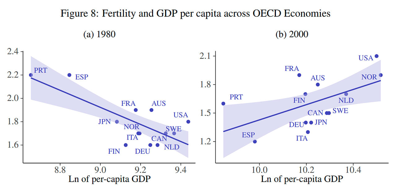 This U-shaped pattern shows up in macro cross-country comparisons too. Earlier in the 20th century when most high-income countries were still going through their demographic transition, the relationship between GDP per capita and fertility was negative. The world was on the left side of the U-shaped curve. Today, all of these countries are much wealthier and the correlation is now positive: higher income countries also have higher fertility.