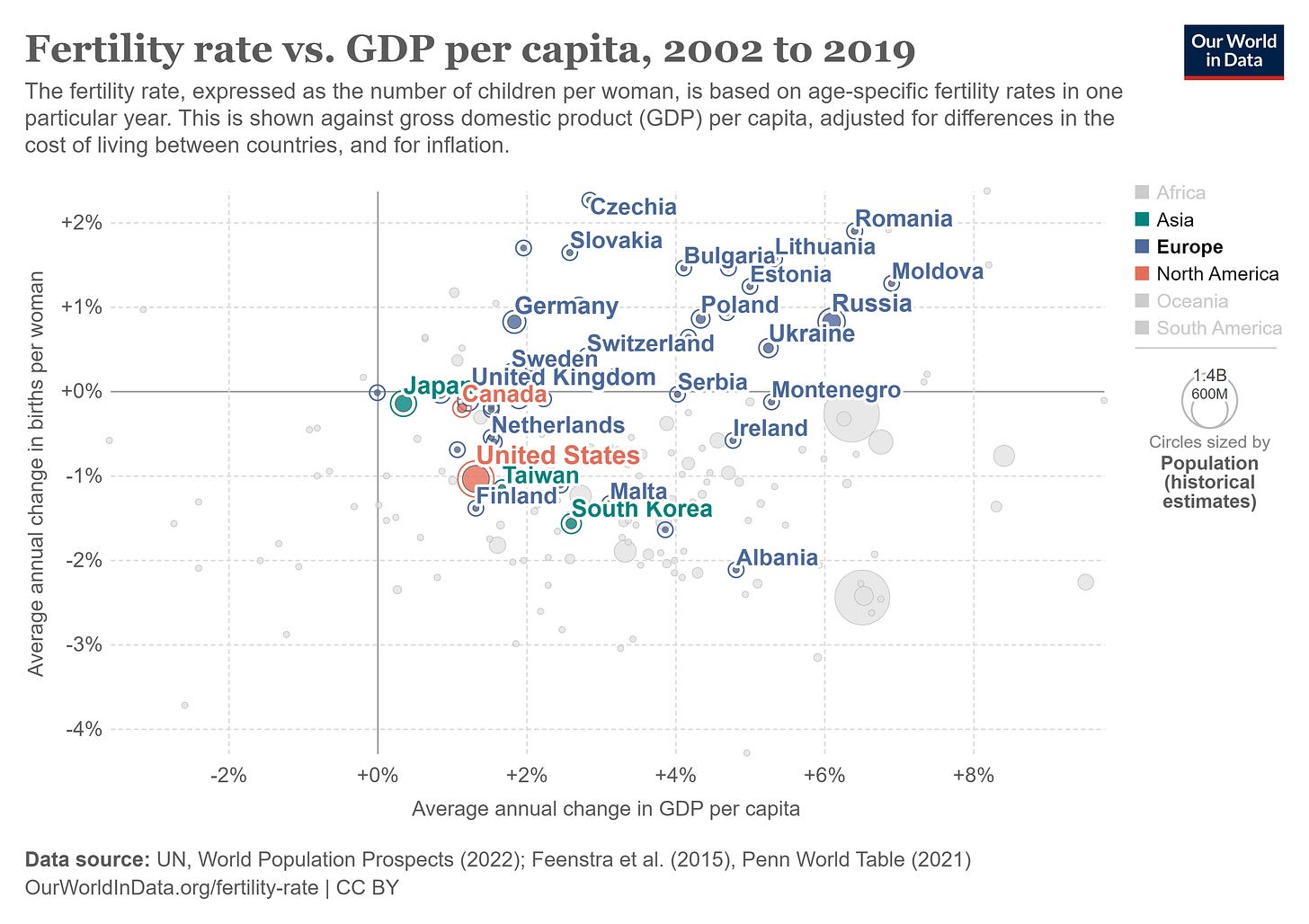 But the gdp per capita graphs I think are evidence against that view. It looks like the curve is a lot flatter than when fertility is rising than when it’s dropping, but if this holds into the future I really don’t worry too much. We’re on the cusp of all getting a lot richer, or else AI will kill us all anyway.