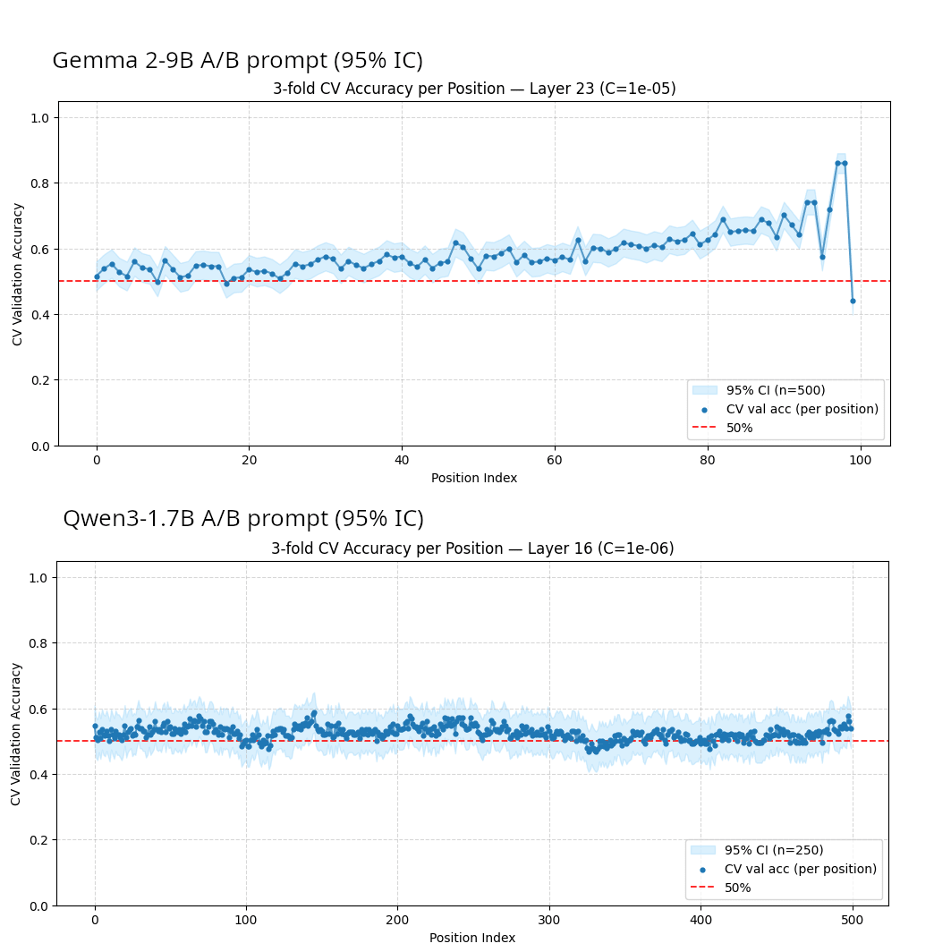 Data analysis: I report the accuracy of the probes at each position with confidence intervals and 3-fold cross validation to identify at which positions the probe can infer the actual answer with better than random accuracy.