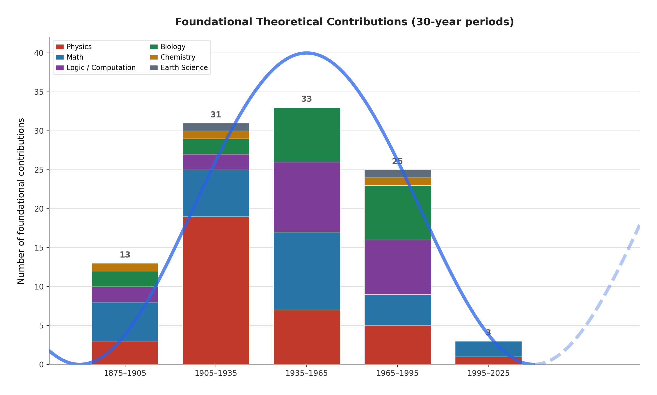 I’ve made some effort to apply the generalization/non-generalization framework on the biggest scale. From this height, only the biggest tectonic shifts are what counts—new axioms reshaping sciences or new fields being founded. I don’t aim to undermine anyone who contributed their best to science and didn’t reach the Gödel/Turing/Einstein/Bohr level of change in their field. But I think we can agree that given those examples, they are the ones that count from this height. And given the criteria “foundational theoretical contributions”, you probably can already feel the distribution shape.