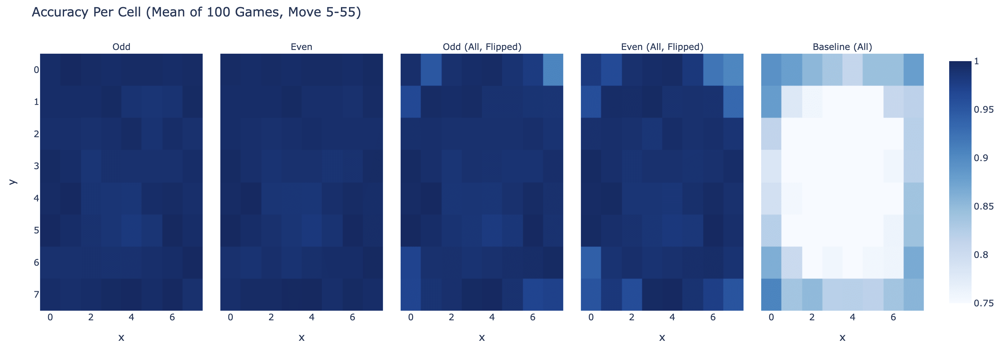 The probe works pretty great for layer 6! And odd (black to play) transfers fairly wel zero shot to even (white to play) by just swapping what mine and your’s means (with worse accuracy on the corners). (This is the accuracy taken over 100 games, so 5000 moves, only scored on the middle band of moves)