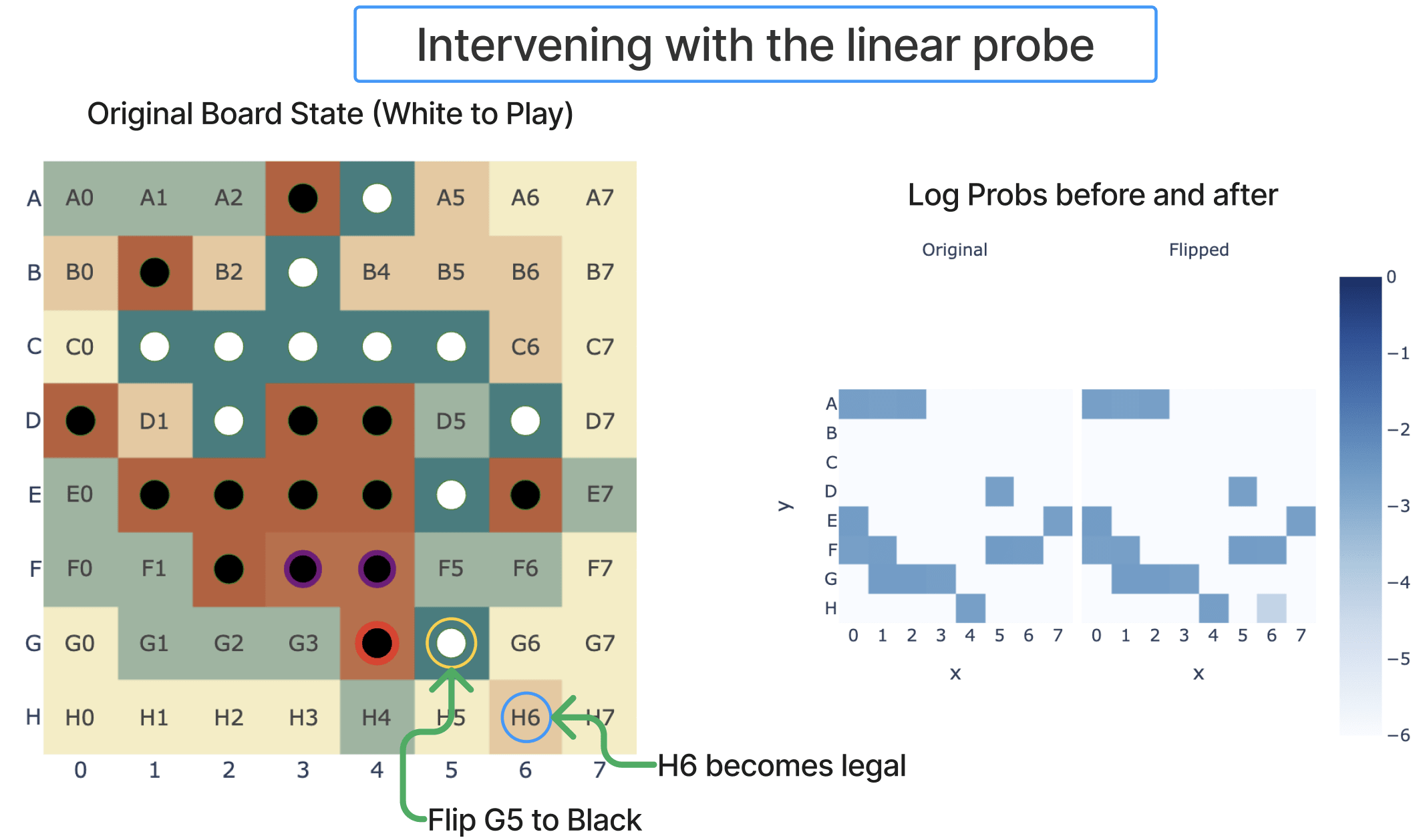 We can causally intervene with the linear probe, and the model makes legal moves in the new board!