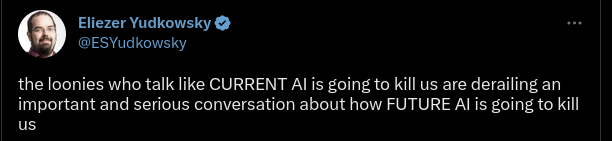 But, as yudkowsky has said on twitter before (this does not mean I endorse everything the dude says on twitter, I’m no fan of him and I avoided this site for a long time due to thinking he had his head in the sand and didn’t understand the thing he was panicking about very well -)