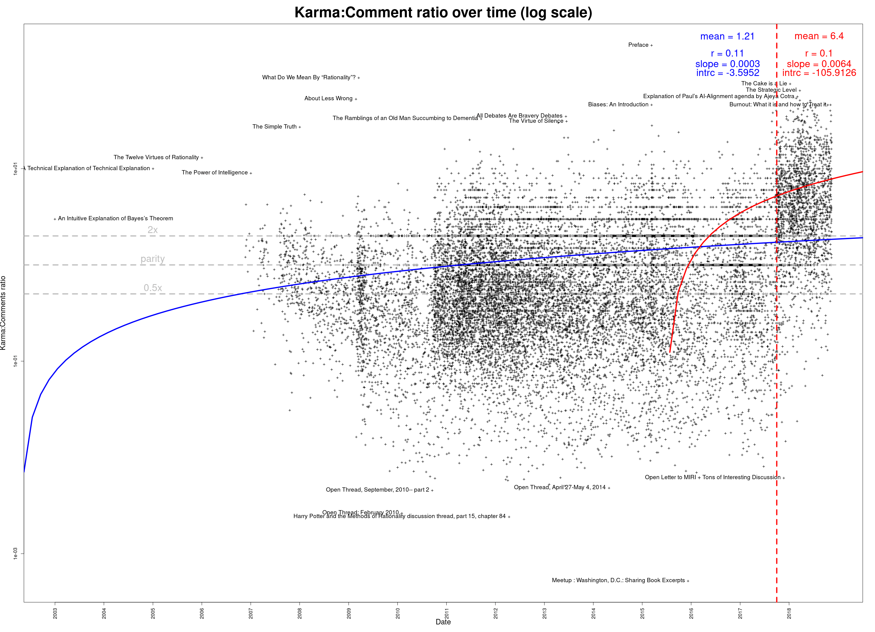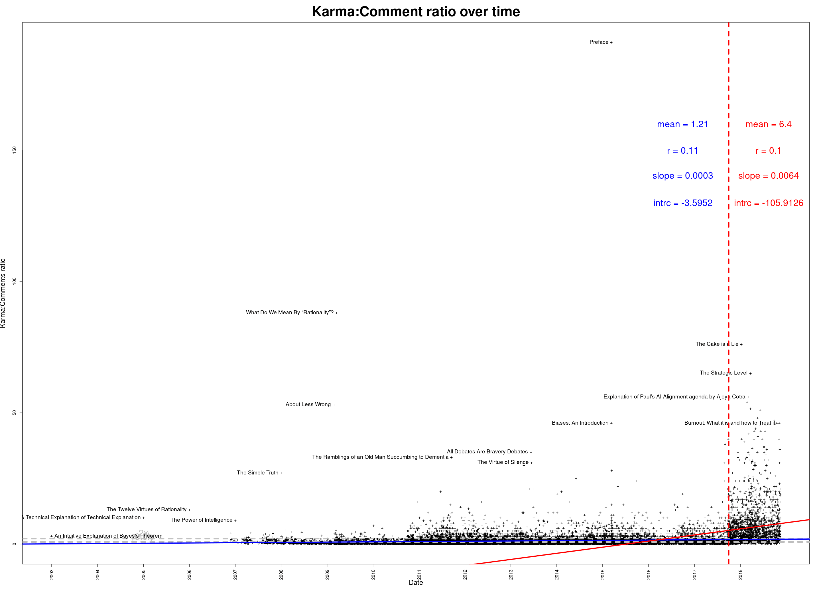 Thanks to Betawolf on IRC for this graph, which plots ratio of karma to comment count vs. time, and shows some interesting statistics: