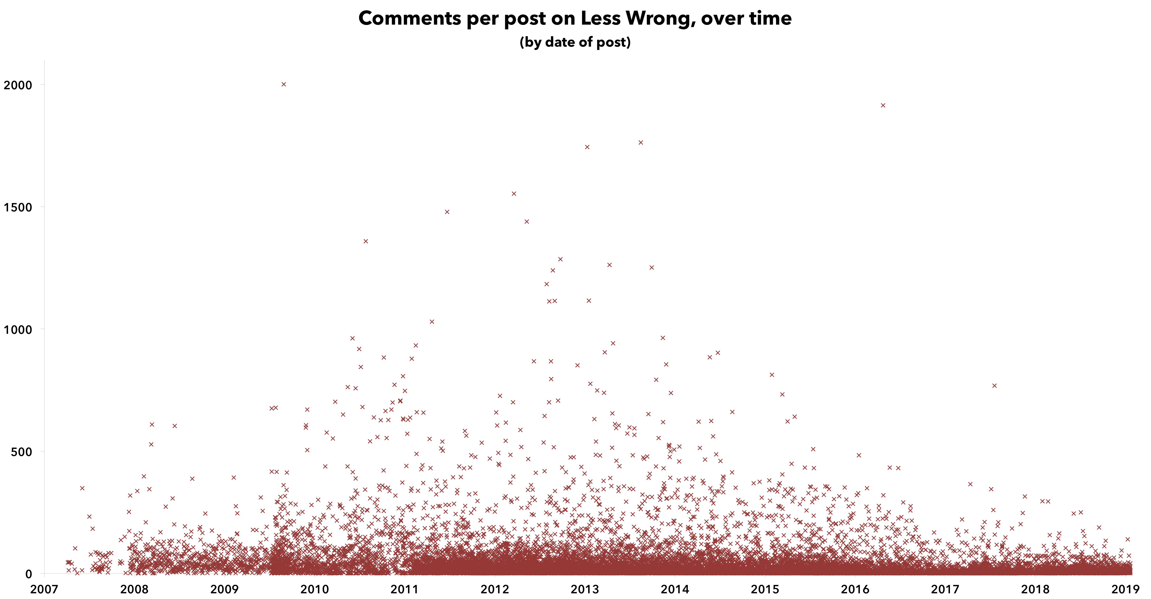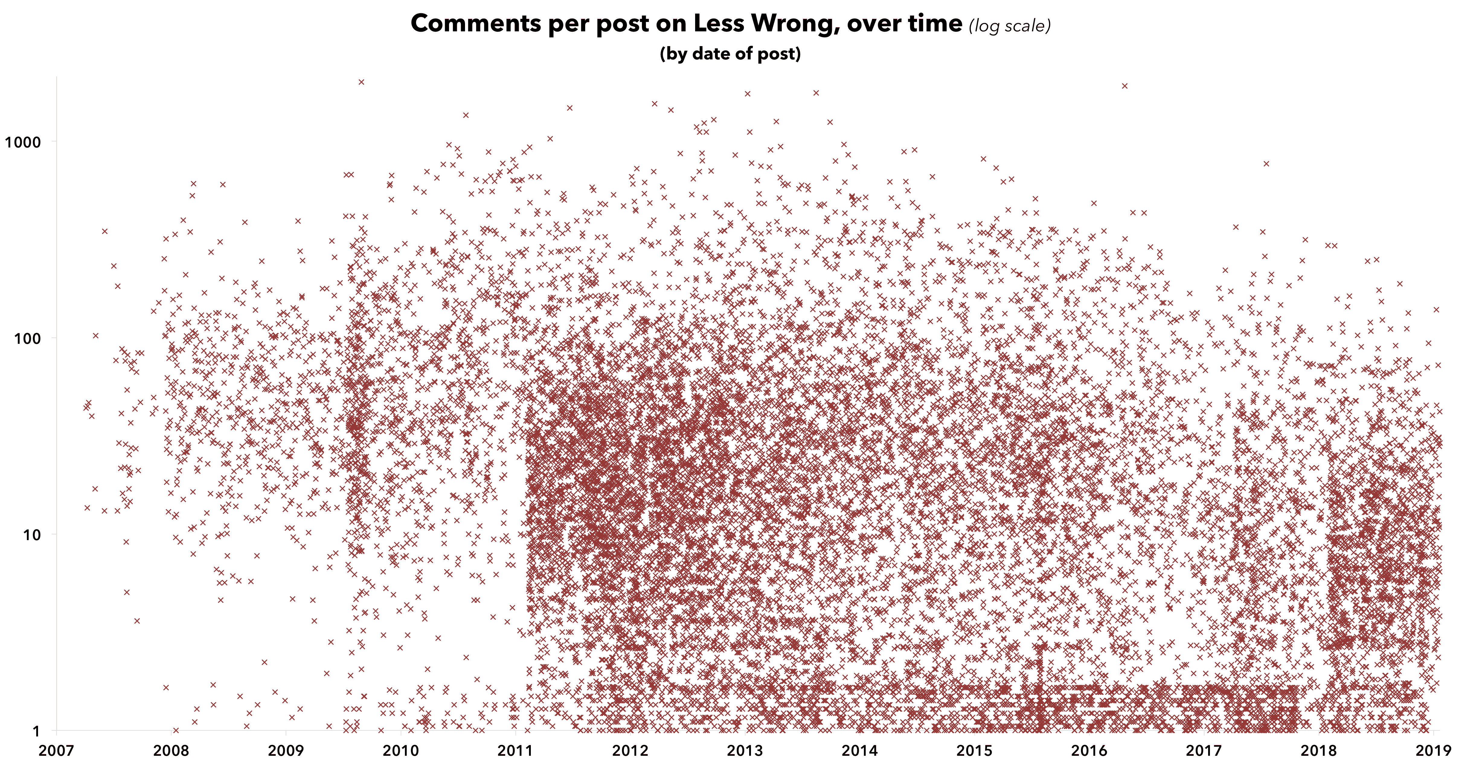 Median number of comments/post seems to have gone up a bit since the relaunch, at least according to the graphs I posted below. Average number probably has probably stayed roughly the same, which I think is mostly the cause of Scott moving to his own blog, and his posts continuing to create infinite amounts of comments.
