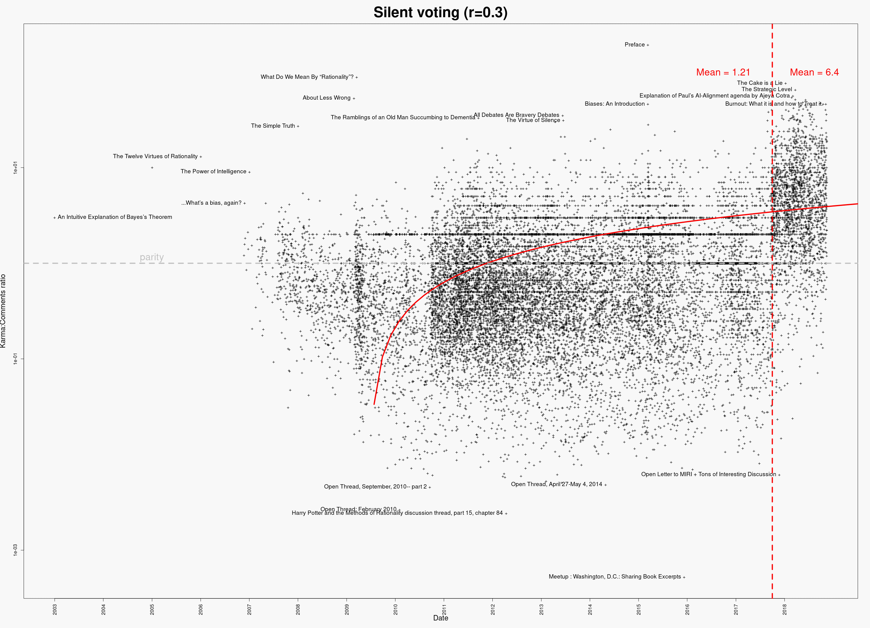Overall, I think the launch shows up relatively clearly on a bunch of the metrics I posted below, and it’s too hard to eye-ball scatter plots to judge on the plots above, though I agree that the overall effect of the relaunch on number of comments is relatively minor.