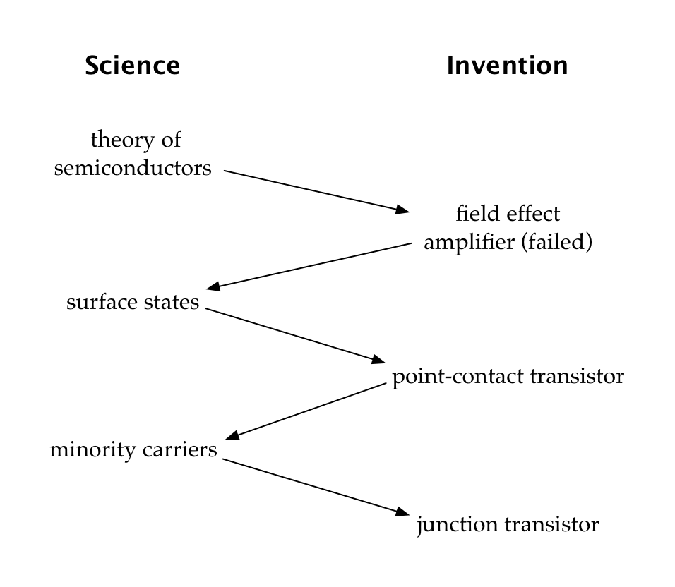 In Shuttling Between Science and Invention, Jason Crawford talks about the invention of the transistor. It involved multiple iterations of noticing some weird phenomenon with semiconductors, coming up with a theory to explain the weirdness, prototyping a device based on the theory, seeing the device not work quite like the theory predicted (and therefore noticing some weird phenomenon with semiconductors), and then going back to the theorizing. The key interplay is the back-and-forth between theory and invention/experiment.