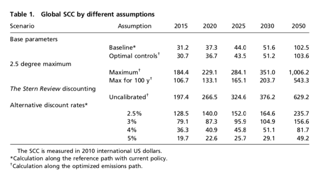 Now, obviously, if Nordhaus’s model had included, say, Antarctica completely melting and many major cities going completely underwater due to a series of major sea ice and other tipping points being crossed, the social cost of carbon would need to be a lot higher. So implicitly the risk of such scenarios is considered low in such models. At a more subtle level, the particulars of these optima depend on the expected cost of decarbonization (which depends on the rate of technological innovation), on the temporal discount rates used (you can see in the table above that prices rapidly rise with decreasing discount rate), and on other factors.