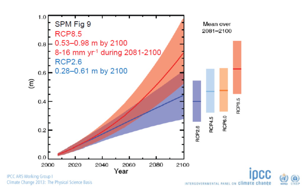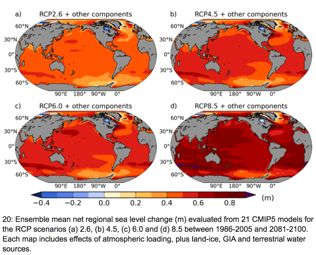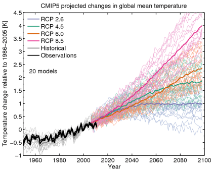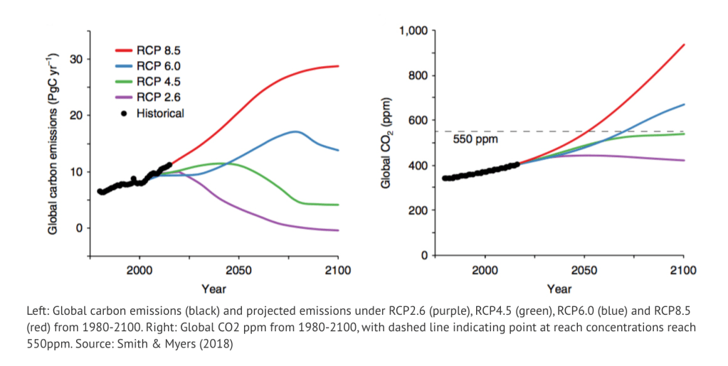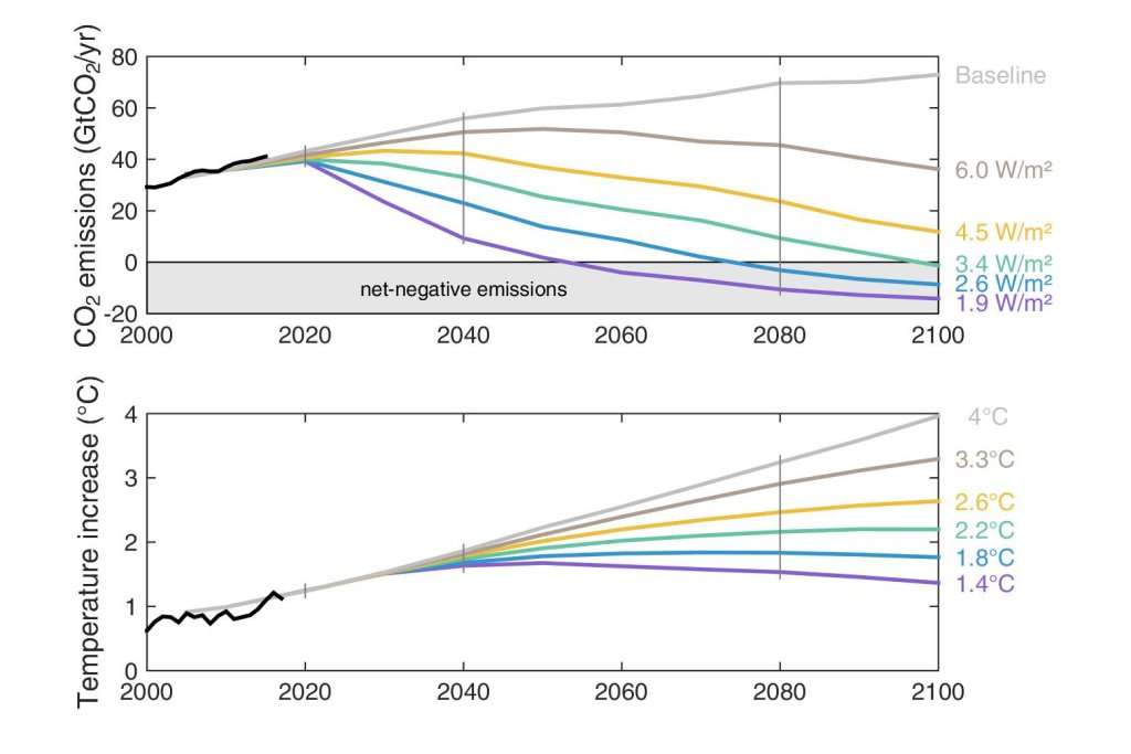 Here is one example graph from Glen Peters on Twitter, with emissions scenarios (top) and their associated global average surface temperatures (bottom) — and be careful to look at the peak temperature along the lower graph, not just the value reached in 2100: