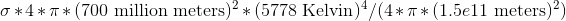 which is then by the time it reaches the Earth spread over a sphere of radius given by the Sun-Earth distance of 1.5e11 meters, so the solar flux per unit area is