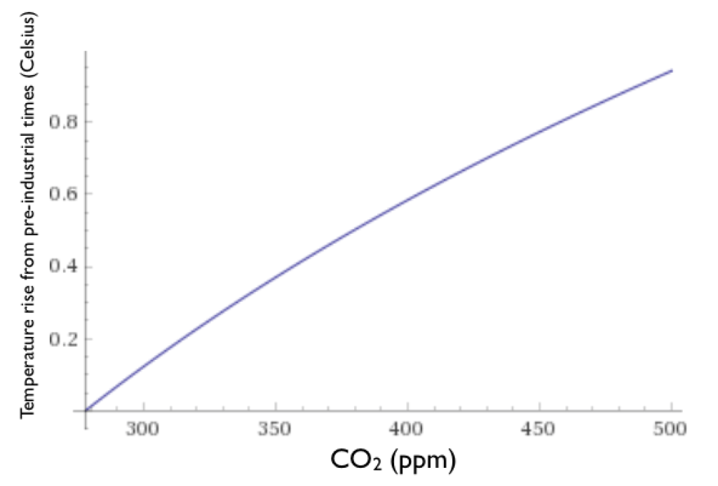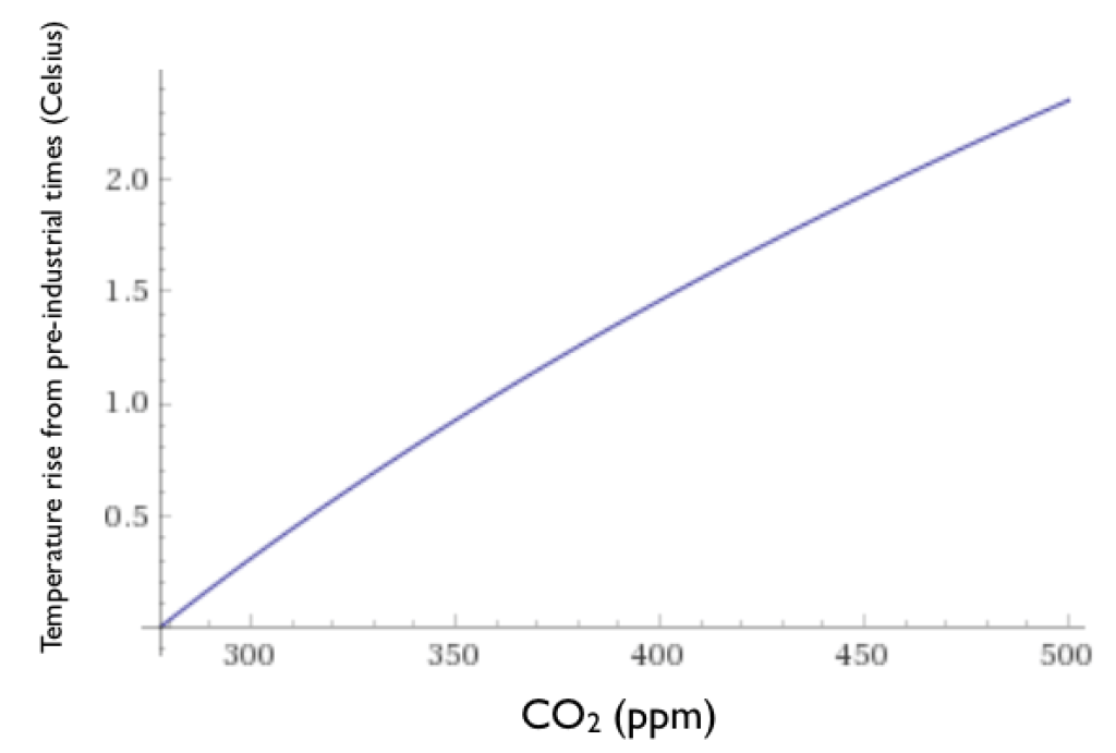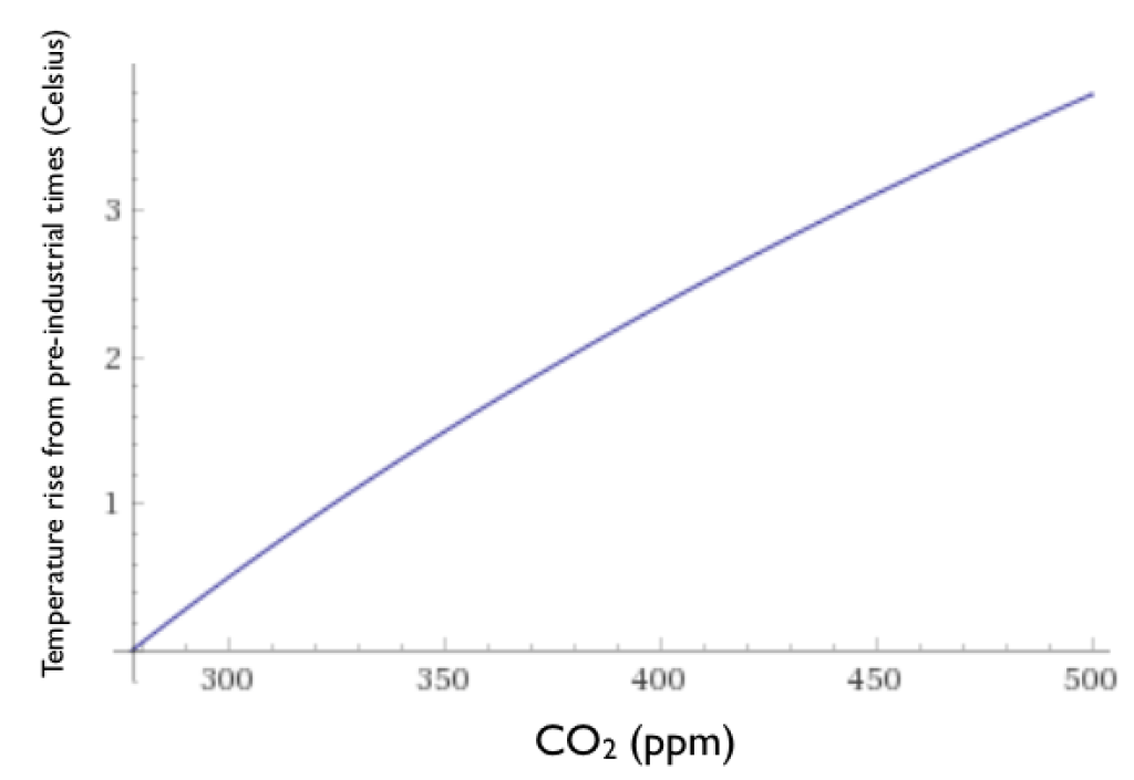 Naively, if we think of the only effect of CO2 as being the absorption of some of the outgoing infrared thermal radiation from the planet surface, then more CO2 means higher ε, with no change in albedo A. However, in reality, more warming also leads to more water vapor in the atmosphere, which — since water vapor is itself a greenhouse gas — can lead to more greenhouse effect and hence more warming, causing a positive feedback. On the other hand, if the extra water vapor forms clouds, that can increase the albedo, decreasing warming by blocking some of the incoming solar radiation from hitting the surface, and leading to a negative feedback. So it doesn’t seem obvious even what functional form the impact of CO2 concentration on ε and A should take, particularly since water vapor can play multiple roles in the translation process.