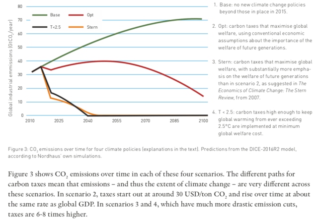 The fact is, as the Nobel Prize announcement notes, there are huge uncertainties in what would really be optimal (even within the philosophical frame that underlies Nordhaus’s analysis, e.g., with the type and rough magnitude of the discount rate he uses, and even neglecting the politics of passing such taxes) — it depends on the cost of decarbonizing quickly, and on the climate damage cost of not decarbonizing quickly, both of which are highly uncertain at present. So we have to take a best guess — but that best guess should incorporate the uncertainty.