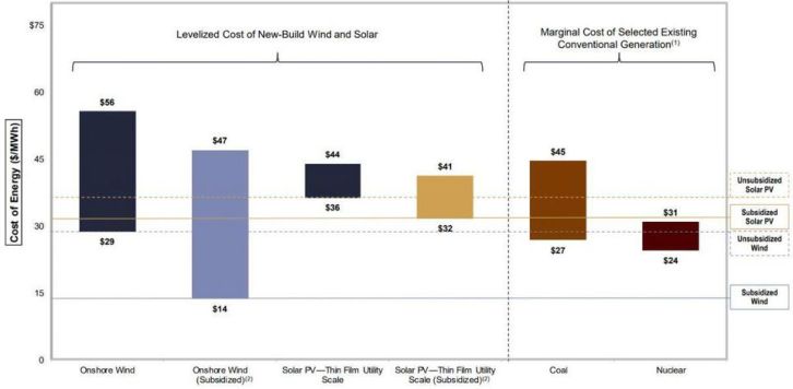 Subsidies have helped drive down the cost of wind and solar energy to the point where they are cost-competitive with fossil fuels (in some settings and up to some level of scale) — this is fantastic, as it means it is feasible to massively build them out now, which we should do. As I mentioned in the disclaimers, deploying existing technology now is important as there is a tightly limited feasible carbon budget in the coming few decades and we can’t afford to wait to curb emissions if we want to limit the peak CO2 concentration reached. Arguably, the scenarios in integrated assessment models may not be sufficiently accounting for how fast prices can drop as technologies like solar get deployed at larger scales. Here is a nice article from Megan Mahajan on the plunging price of renewables, building on studies by Lazard, and there are other such studies here: the results from Lazard are shown in the following figure