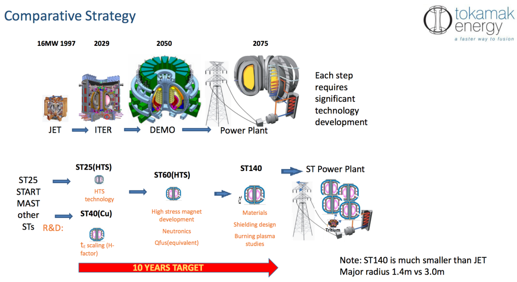 There are a number of companies pursuing things that are along these lines of some kind of next-gen compact magnetic confinement, including Commonwealth Fusion, Tokamak Energy, and Lockheed Martin’s Skunkworks. Here is a figure from some slides online from Tokamak Energy describing their ambitious timeline (“ST” indicates “spherical tokamak” and HTS means “high temperature superconductor”):
