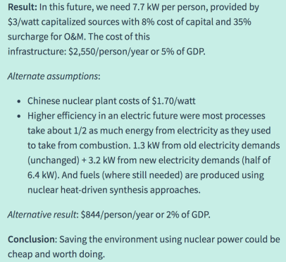 Some would propose to keep existing nuclear plants operating, but wait for the cost, speed of deployability, safety and performance of next-generation nuclear systems — like “small modular reactors” — to improve before deploying new nuclear. But the idea that existing nuclear is fundamentally too expensive in the current regulatory environment is perhaps at least debatable. Nuclear is the largest single source of energy in France with 58 reactors — although the just-linked post points out that the French nuclear industry is in financial trouble. In this blog post Chris Uhlik calculates what it would take to scale up nuclear technologies at current cost levels, and concludes the following