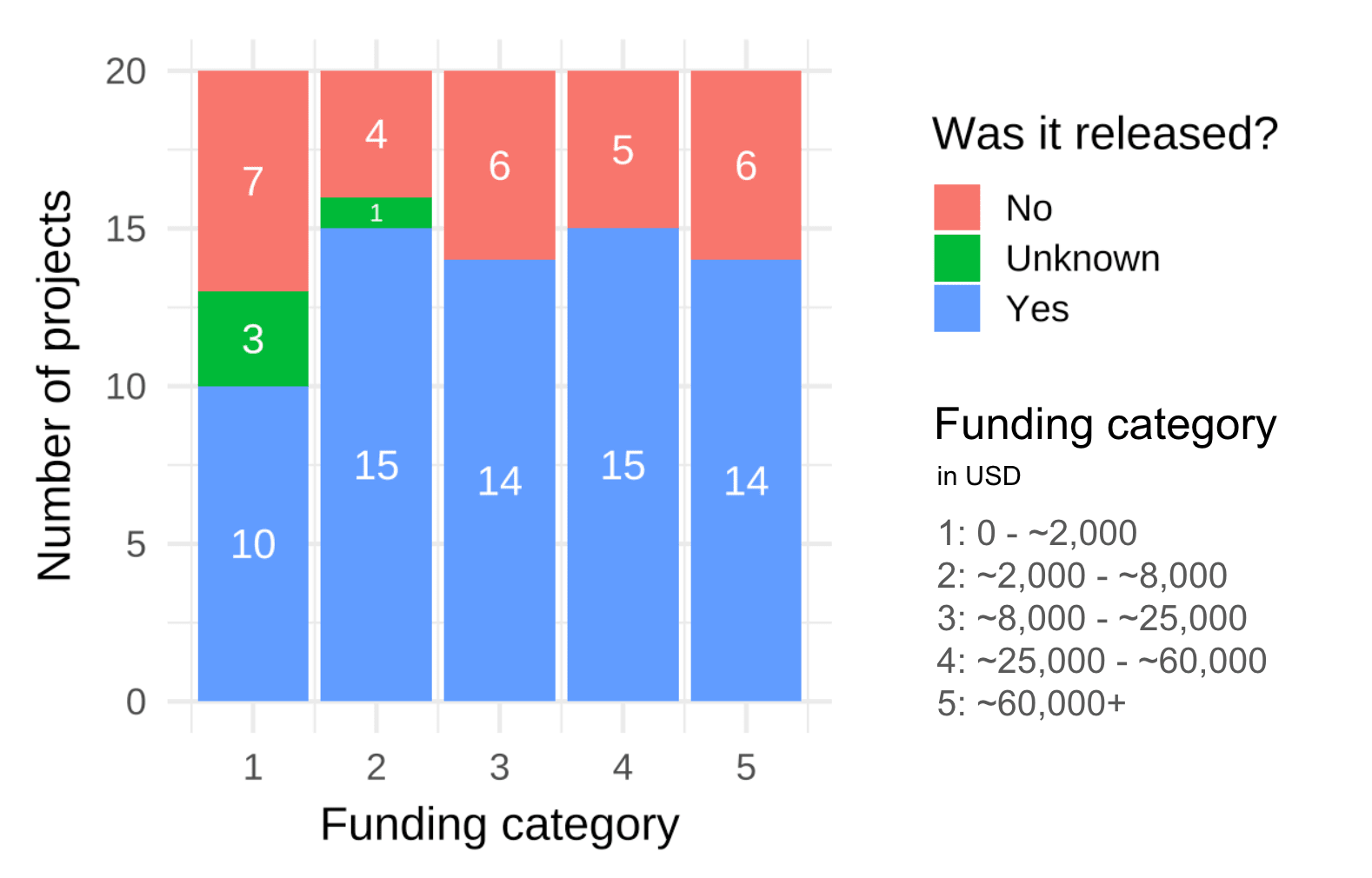 Again, I used the ntile() dplyr function in R, separating all the possible projects to pick from into 5 funding categories with the same amount of projects. I performed this separately for the 2014 and 2022 datasets. I then randomly selected 20 projects from each funding level.