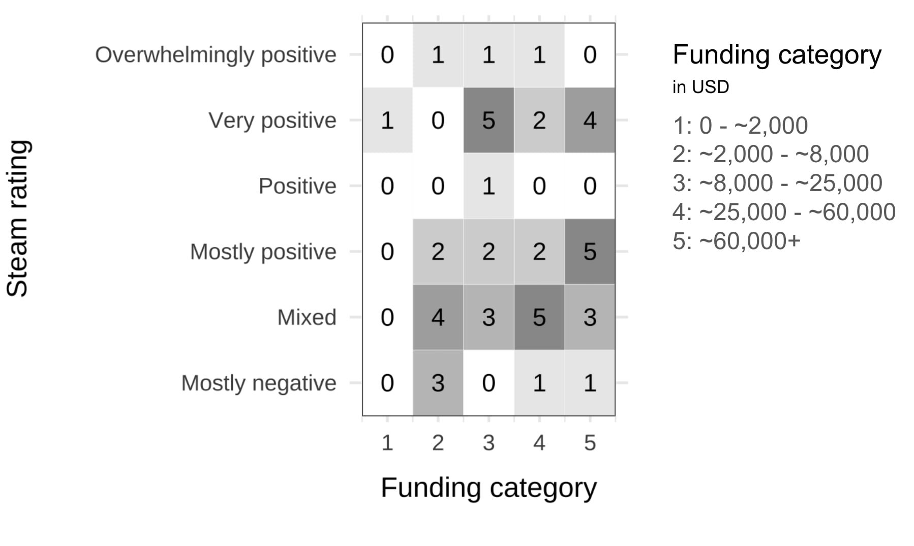 Similarly, we may also expect that social pressure and funding amount would be related to the quality of the game, which would probably be reflected in how many people liked it. For 47 of the games, I was able to collect steam rating data. There was no obvious relationship here, but there’s also not that much data.