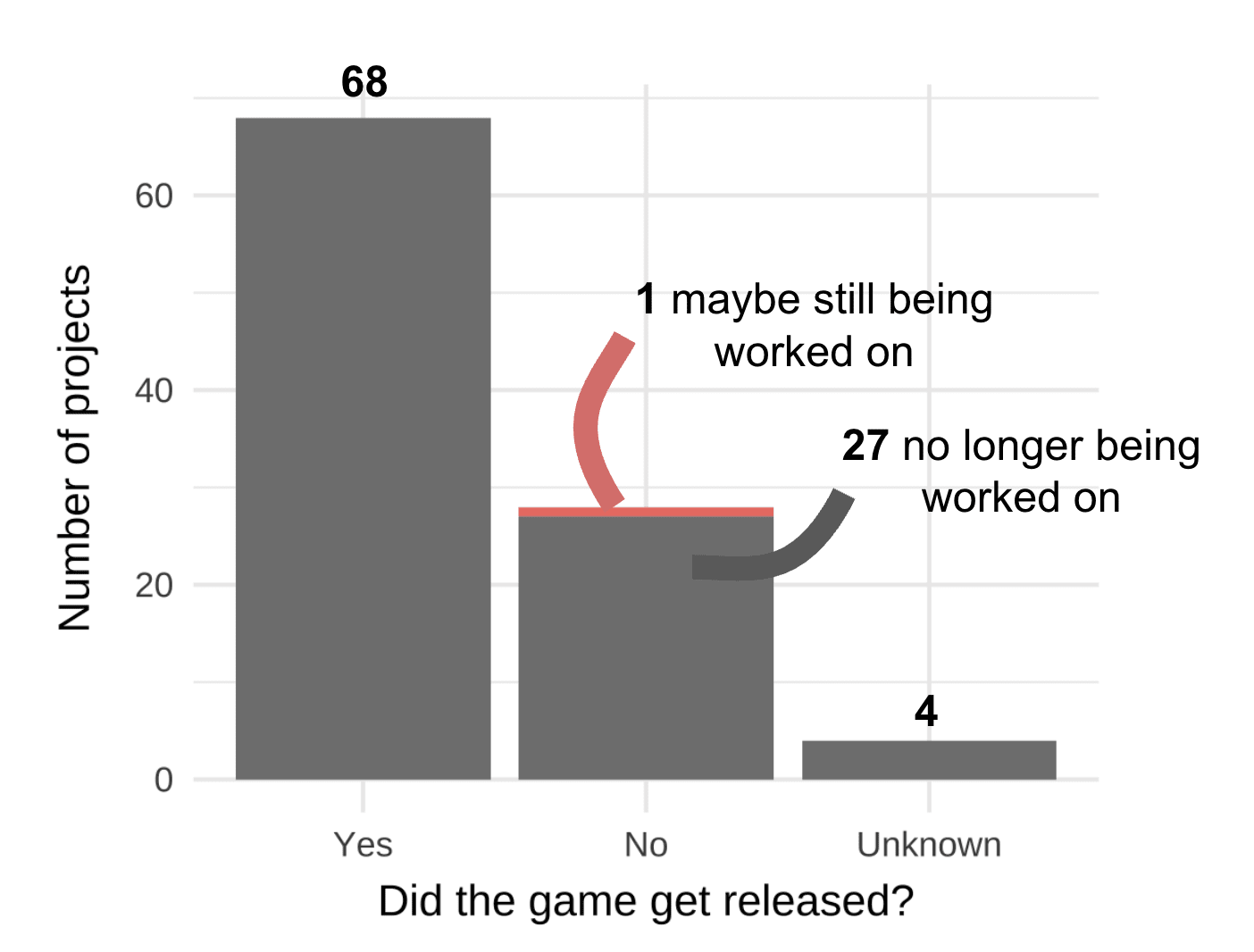 So, while that research had found a failure rate of ~12% for fully-funded video games, I found a substantially higher rate. Of the 100 games that I looked at with funding deadlines in 2014, I could confirm that 68 of them had been released. There were 4 projects where I was unclear about whether they had produced anything, and the other 28 games seemed to have never come to fruition. Only one of these 28 seemed to not have been abandoned.
