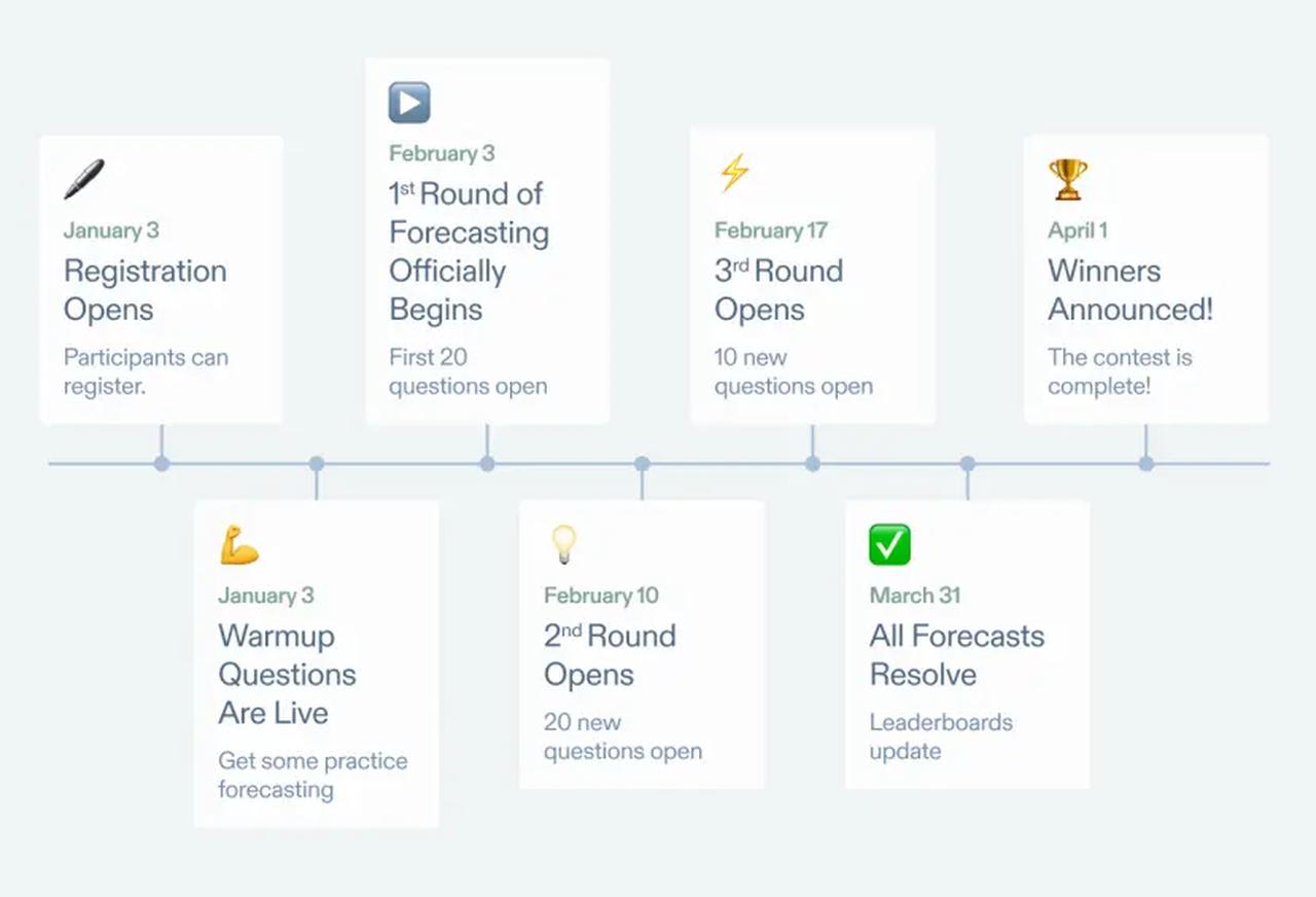 This contest features a unified set of 50 forecasting questions, with two distinct leaderboards: one for all participants in the Open Competition and another specifically for undergraduate students in the Undergraduate Competition.