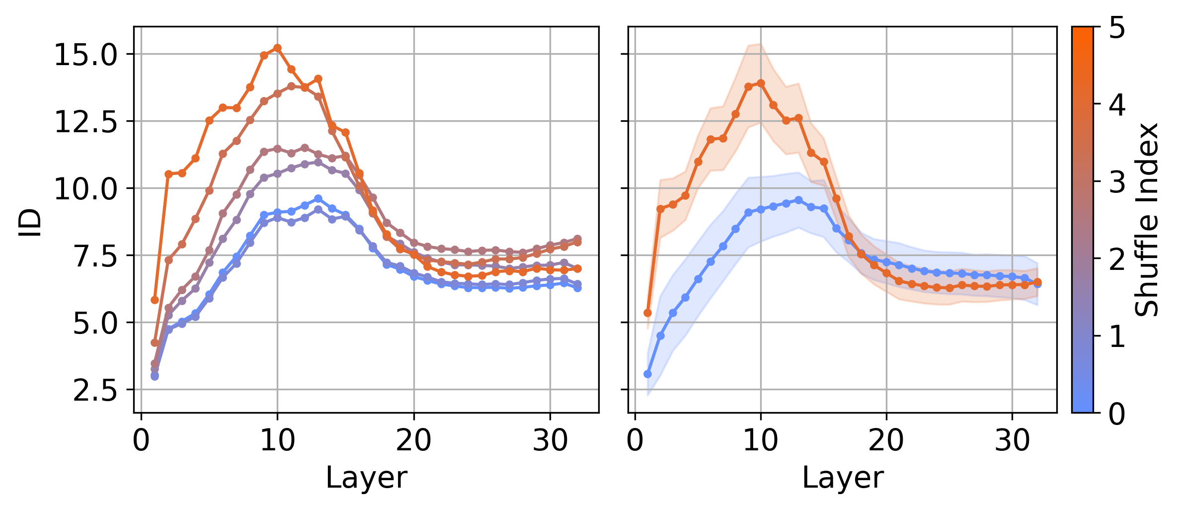 The left panel shows the ID profile of a single prompt at various levels of shuffling, while the right panel presents the average ID across 2244 prompts for both fully shuffled and structured cases for the Llama-3-8B model. A larger shuffle index indicates a higher degree of shuffling. In all scenarios, we observe a peak in ID in the early to middle layers. Additionally, the height of this peak increases with the degree of shuffling, indicating a relation between the two. This experiment also serves to distinguish the geometry of last-token representations and tokens within a prompt since the shuffling results in a lower intrinsic dimension for last-token representations as shown in this paper.