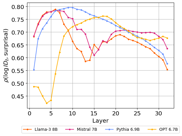 All four models have a high positive correlation across the layers of the model, implying that prompts with a higher average surprisal have a higher intrinsic dimension. This observation is qualitatively consistent with the shuffling experiment since the shuffled data is expected to have a higher surprisal and hence a higher intrinsic dimension. Notably, this correlation exists in the early layers even though the surprisal is calculated after the final layer.