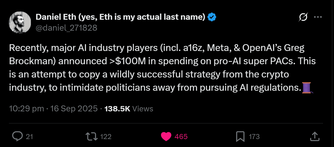 Recently, major AI industry players (incl. a16z, Meta, & OpenAI’s Greg Brockman) announced >$100M in spending on pro-AI super PACs. This is an attempt to copy a wildly successful strategy from the crypto industry, to intimidate politicians away from pursuing AI regulations.🧵