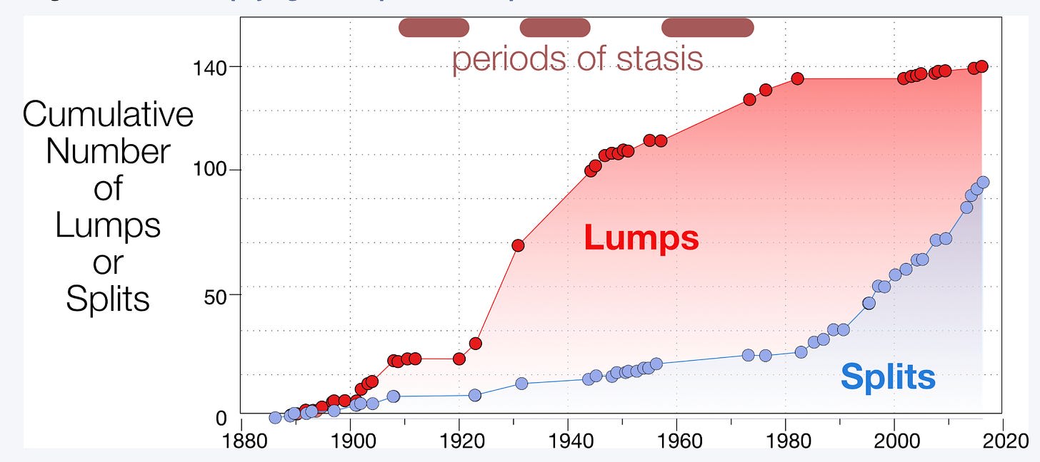 You will notice that until the 1980s, there were more lumps than splits, until genetic tools started becoming more widespread, and genetic differences in species were detectable everywhere. This inspired splits such as that between the Eastern and Western Meadowlark, the Black-capped and Carolina Chickadee, the Indigo and Lazuli Bunting, and many other pairs which regularly produce fertile offspring and have strong gene flow between them.