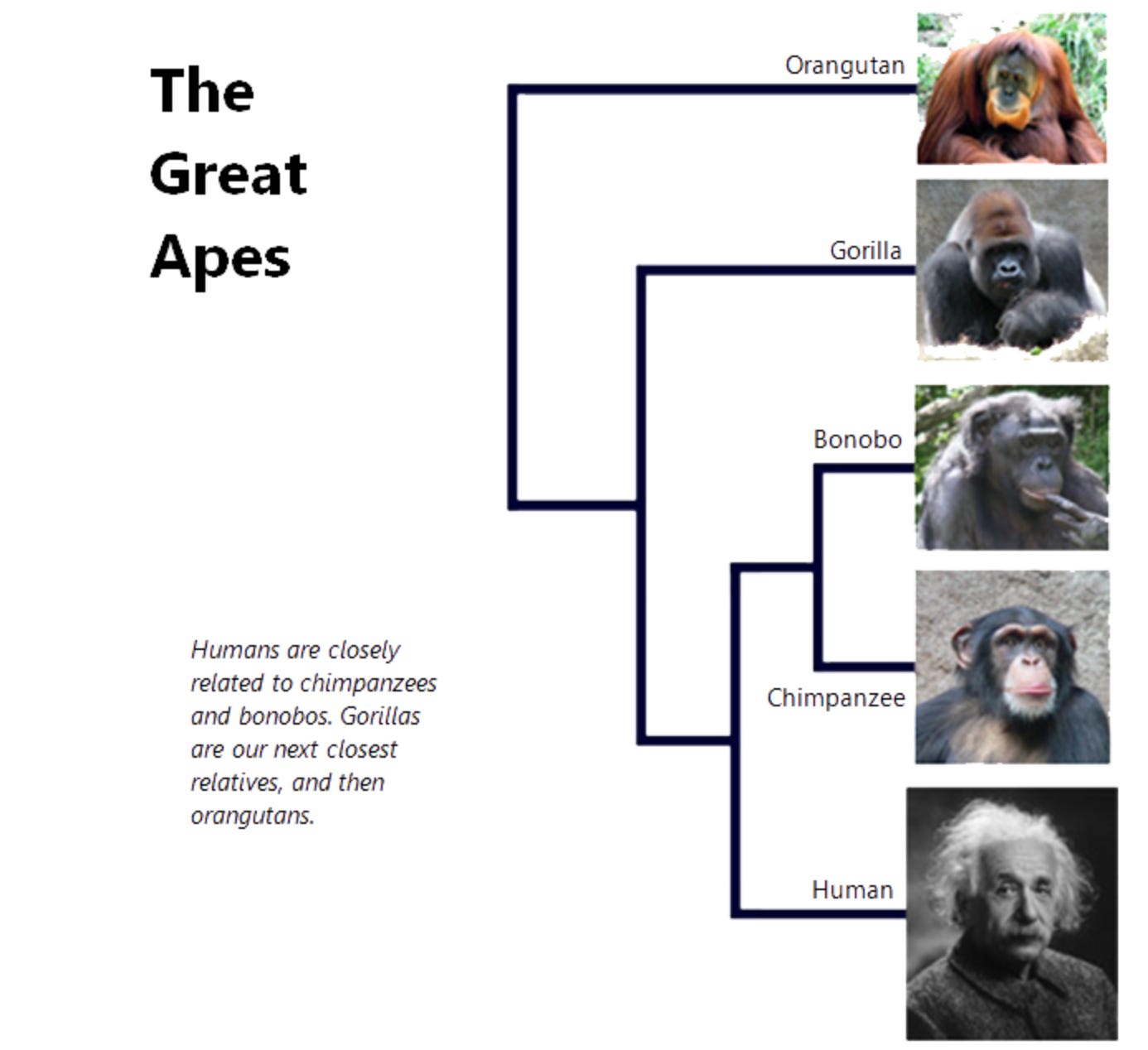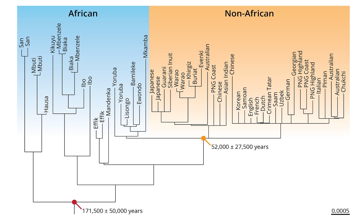 Very simple. And look at that! The tips all correspond to the 5 generally accepted species of great ape. How convenient! Only one problem. Here’s a phylogeny of all modern humans.