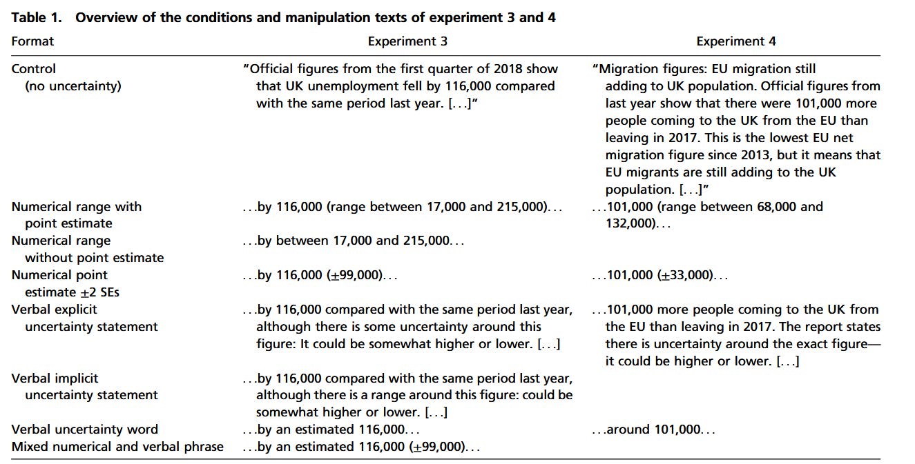 People were told the number either without mentioning uncertainty (as a control), with a numerical range, or with a verbal statement that uncertainty exists for these numbers. The study did not investigate stating p-values for beliefs. Exact statements used in the survey can be seen in Table 1, in the appendix.
