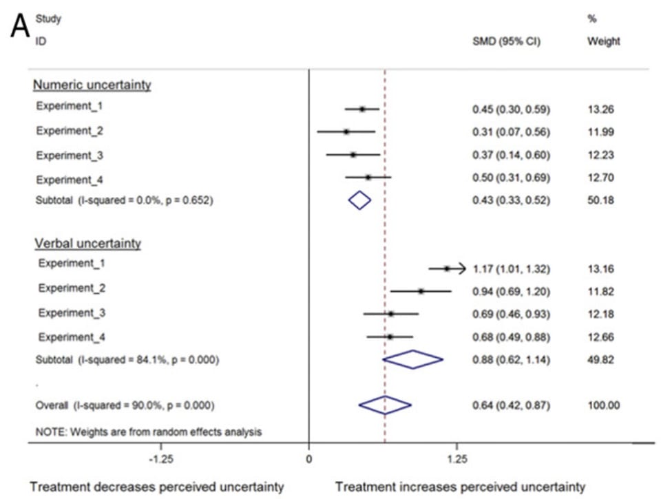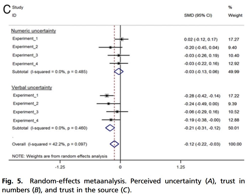 The surveys distinguished between trust in the number itself (B) and trust in the source (C). Numerically expressing uncertainty resulted in a small decrease in the trust of that number. Verbally expressing uncertainty resulted in a larger decrease in the trust of that number. Numerically expressing uncertainty resulted in no significant change in the trust of the source. Verbally expressing uncertainty resulted in a small decrease in the trust of the source.