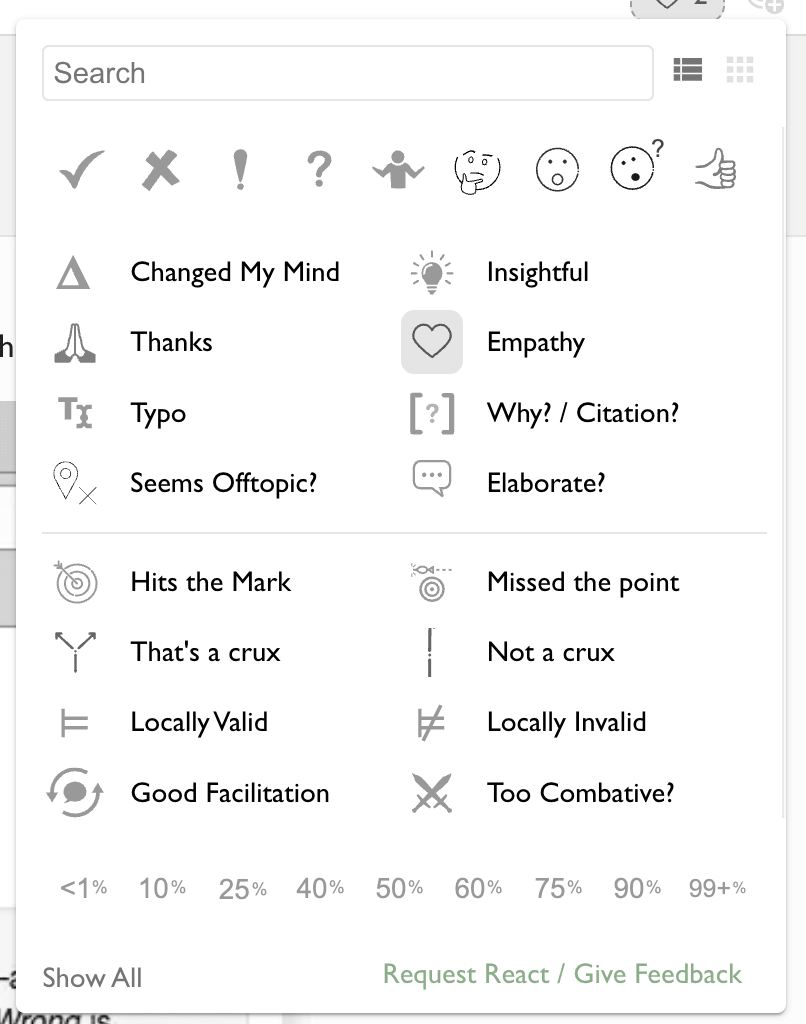 And, the biggest change is d) which is to mark how likely a claim is via reacting. I’m imagining this primarily used via inline-reacting. If a lot of people end up using it might make sense to build a more specialized system for this, but it seemed to cheap to add via Reacts for the immediate future.