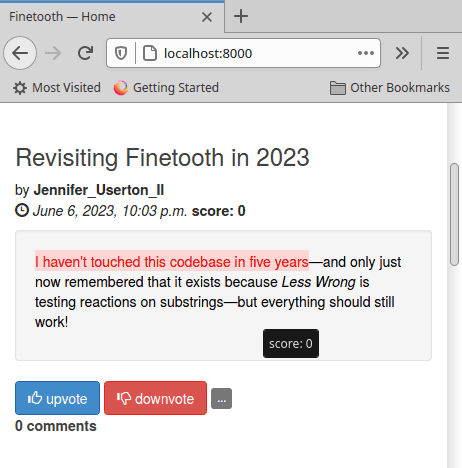 Oh, so that’s what “inline” reacts are! This brings me back: back in 2014, I wrote a prototype discussion forum (inspired by a weird sun Tweet) where you could upvote or downvote snippets within a post or comment, which would get correspondingly colored blue or red. The backend was Django, and the substring voting worked by traversing the DOM tree and working out the character indices where the current selection starts and ends. More innocent times! I miss jQuery.
